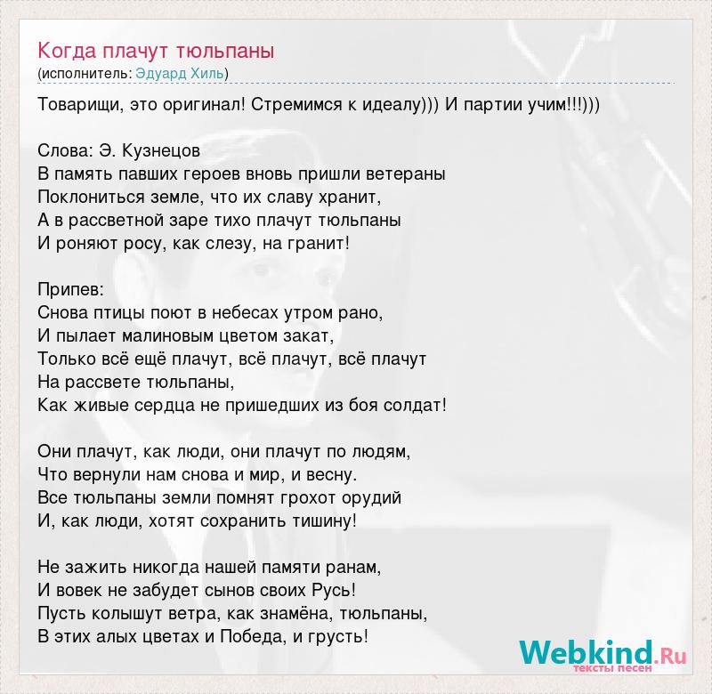 Товарищи, это оригинал! Стремимся к идеалу))) И партии учим!!!))) Слова: Э. Кузнецов В память павших героев вновь пришли ветераны Поклониться земле, что их славу хранит, А в рассветной заре тихо плачут тюльпаны И роняют росу, как слезу, на гранит! Припев: Снова птицы поют в небесах утром рано, И пылает малиновым цветом закат, Только всё ещё плачут, всё плачут, всё плачут На рассвете тюльпаны, Как живые сердца не пришедших из боя солдат! Они плачут, как люди, они плачут по людям, Что вернули нам снова и мир, и весну. Все тюльпаны земли помнят грохот орудий И, как люди, хотят сохранить тишину! Не зажить никогда нашей памяти ранам, И вовек не забудет сынов своих Русь! Пусть колышут ветра, как знамёна, тюльпаны, В этих алых цветах и Победа, и грусть!