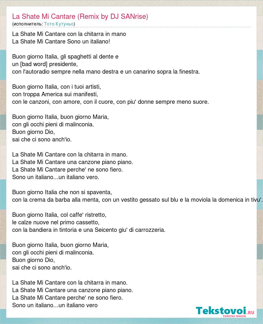 La Shate Mi Cantare con la chitarra in mano La Shate Mi Cantare Sono un italiano! Buon giorno Italia, gli spaghetti al dente e un [bad word] presidente, con l'autoradio sempre nella mano destra e un canarino sopra la finestra. Buon giorno Italia, con i tuoi artisti, con troppa America sui manifesti, con le canzoni, con amore, con il cuore, con piu' donne sempre meno suore. Buon giorno Italia, buon giorno Maria, con gli occhi pieni di malinconia. Buon giorno Dio, sai che ci sono anch'io. La Shate Mi Cantare con la chitarra in mano. La Shate Mi Cantare una canzone piano piano. La Shate Mi Cantare perche' ne sono fiero. Sono un italiano...un italiano vero. Buon giorno Italia che non si spaventa, con la crema da barba alla menta, con un vestito gessato sul blu e la moviola la domenica in tivu'. Buon giorno Italia, col caffe' ristretto, le calze nuove nel primo cassetto, con la bandiera in tintoria e una Seicento giu' di carrozzeria. Buon giorno Italia, buon giorno Maria, con gli occhi pieni di malinconia. Buon giorno Dio, sai che ci sono anch'io. La Shate Mi Cantare con la chitarra in mano. La Shate Mi Cantare una canzone piano piano. La Shate Mi Cantare perche' ne sono fiero. Sono un italiano...un italiano vero
