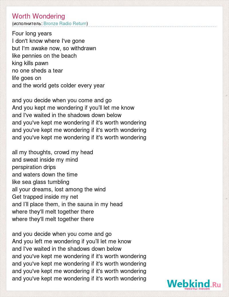 Four long years I don't know where I've gone but I'm awake now, so withdrawn like pennies on the beach king kills pawn no one sheds a tear life goes on and the world gets colder every year and you decide when you come and go And you kept me wondering if you’ll let me know and I've waited in the shadows down below and you've kept me wondering if it's worth wondering and you've kept me wondering if it's worth wondering and you've kept me wondering if it's worth wondering all my thoughts, crowd my head and sweat inside my mind perspiration drips and waters down the time like sea glass tumbling all your dreams, lost among the wind Get trapped inside my net and I’ll place them, in the sauna in my head where they'll melt together there where they'll melt together there and you decide when you come and go And you left me wondering if you’ll let me know and I've waited in the shadows down below and you've kept me wondering if it's worth wondering and you've kept me wondering if it's worth wondering and you've kept me wondering if it's worth wondering and you've kept me wondering if it's worth wondering