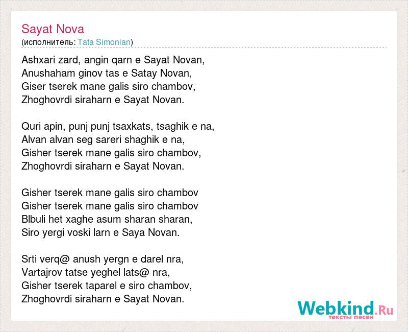 Ashxari zard, angin qarn e Sayat Novan, Anushaham ginov tas e Satay Novan, Giser tserek mane galis siro chambov, Zhoghovrdi siraharn e Sayat Novan. Quri apin, punj punj tsaxkats, tsaghik e na, Alvan alvan seg sareri shaghik e na, Gisher tserek mane galis siro chambov, Zhoghovrdi siraharn e Sayat Novan. Gisher tserek mane galis siro chambov Gisher tserek mane galis siro chambov Blbuli het xaghe asum sharan sharan, Siro yergi voski larn e Saya Novan. Srti verq@ anush yergn e darel nra, Vartajrov tatse yeghel lats@ nra, Gisher tserek taparel e siro chambov, Zhoghovrdi siraharn e Sayat Novan.