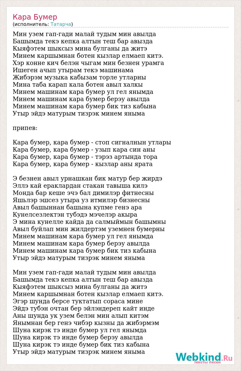 Мин узем гап-гади малай тудым мин авылда Башымда текэ кепка алтын теш бар авызда Кыяфэтем шыксыз мина булганы да житэ Минем каршымнан ботен кызлар елмаеп китэ. Хэр конне кич белэн чыгам мин безнен урамга Ишеген ачып утырам текэ машинама Жибэрэм музыка кабызам торле утларны Мина таба карап кала ботен авыл халкы Минем машинам кара бумер ул гел янымда Минем машинам кара бумер берэу авылда Минем машинам кара бумер бик тиз кабына Утыр эйдэ матурым тизрэк минем яныма припев: Кара бумер, кара бумер - стоп сигналнын утлары Кара бумер, кара бумер - узып кара син аны Кара бумер, кара бумер - тэрэз артында тора Кара бумер, кара бумер - кызлар аны ярата Э безнен авыл урнашкан бик матур бер жирдэ Эллэ кай ераклардан стакан тавыша килэ Монда бар кеше эчэ бал димилэр фитнесны Яшьлэр эшсез утыра уз итмилэр бизнесны Авыл башыннан башына купме генэ ара Кунелсезлектэн тубэдэ мэчелэр акыра Э мина кунелле кайда да салмыймын башымны Авыл буйлап мин жилдертэм уземнен бумерны Минем машинам кара бумер ул гел янымда Минем машинам кара бумер берэу авылда Минем машинам кара бумер бик тиз кабына Утыр эйдэ матурым тизрэк минем яныма Мин узем гап-гади малай тудым мин авылда Башымда текэ кепка алтын теш бар авызда Кыяфэтем шыксыз мина булганы да житэ Минем каршымнан ботен кызлар елмаеп китэ. Эгэр шунда берсе туктатып сораса мине Эйдэ тубэн очтан бер эйлэндереп кайт инде Аны шунда ук узем белэн мин алып китэм Янымнан бер генэ чибэр кызны да жибэрмэм Шуна кирэк тэ инде бумер ул гел янымда Шуна кирэк тэ инде бумер берэу авылда Шуна кирэк тэ инде бумер бик тиз кабына Утыр эйдэ матурым тизрэк минем яныма