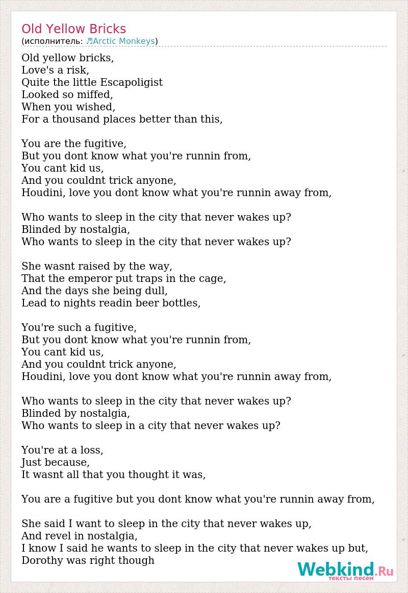 Old yellow bricks, Love's a risk, Quite the little Escapoligist Looked so miffed, When you wished, For a thousand places better than this, You are the fugitive, But you dont know what you're runnin from, You cant kid us, And you couldnt trick anyone, Houdini, love you dont know what you're runnin away from, Who wants to sleep in the city that never wakes up? Blinded by nostalgia, Who wants to sleep in the city that never wakes up? She wasnt raised by the way, That the emperor put traps in the cage, And the days she being dull, Lead to nights readin beer bottles, You're such a fugitive, But you dont know what you're runnin from, You cant kid us, And you couldnt trick anyone, Houdini, love you dont know what you're runnin away from, Who wants to sleep in the city that never wakes up? Blinded by nostalgia, Who wants to sleep in a city that never wakes up? You're at a loss, Just because, It wasnt all that you thought it was, You are a fugitive but you dont know what you're runnin away from, She said I want to sleep in the city that never wakes up, And revel in nostalgia, I know I said he wants to sleep in the city that never wakes up but, Dorothy was right though