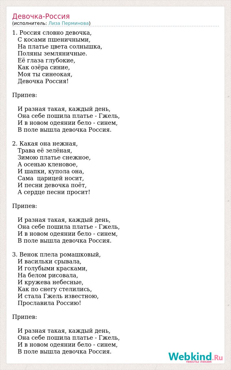 1. Россия словно девочка, С косами пшеничными, На платье цвета солнышка, Поляны земляничные. Её глаза глубокие, Как озёра синие, Моя ты синеокая, Девочка Россия! Припев: И разная такая, каждый день, Она себе пошила платье - Гжель, И в новом одеянии бело - синем, В поле вышла девочка Россия. 2. Какая она нежная, Трава её зелёная, Зимою платье снежное, А осенью кленовое, И шапки, купола она, Сама царицей носит, И песни девочка поёт, А сердце песни просит! Припев: И разная такая, каждый день, Она себе пошила платье - Гжель, И в новом одеянии бело - синем, В поле вышла девочка Россия. 3. Венок плела ромашковый, И васильки срывала, И голубыми красками, На белом рисовала, И кружева небесные, Как по снегу стелились, И стала Гжель известною, Прославила Россию! Припев: И разная такая, каждый день, Она себе пошила платье - Гжель, И в новом одеянии бело - синем, В поле вышла девочка Россия.