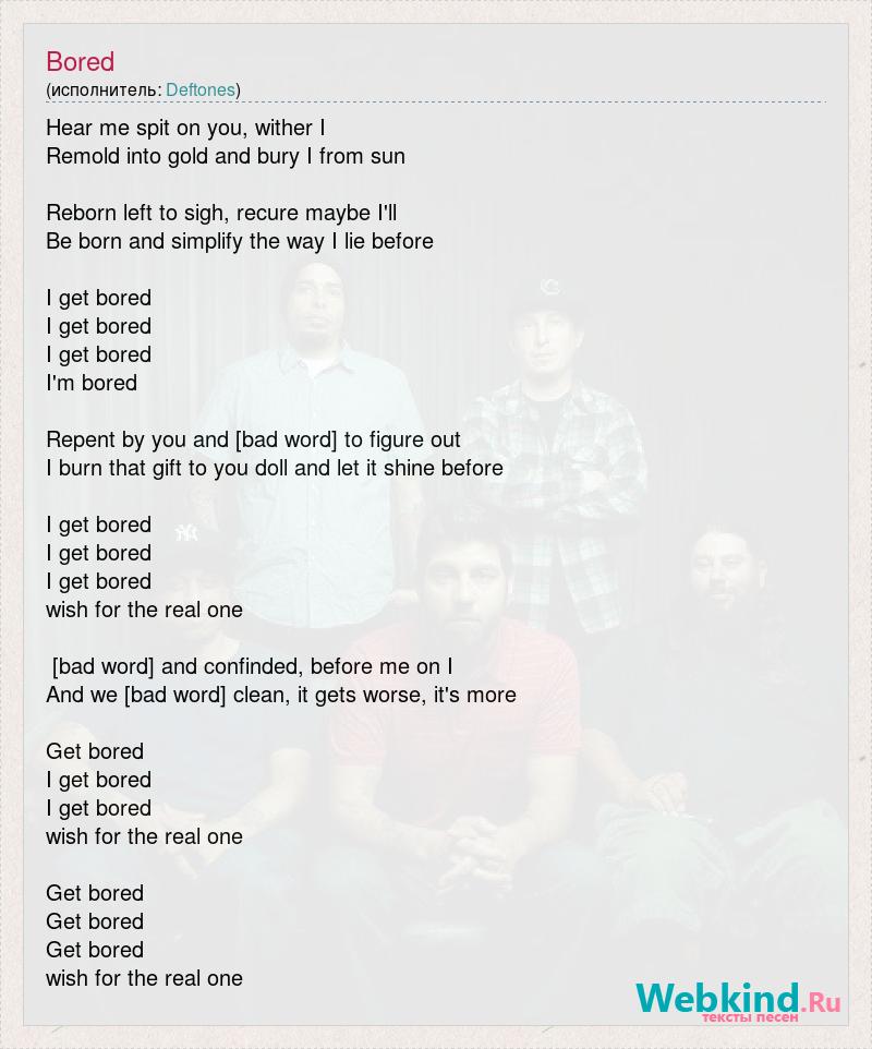 Hear me spit on you, wither I Remold into gold and bury I from sun Reborn left to sigh, recure maybe I'll Be born and simplify the way I lie before I get bored I get bored I get bored I'm bored Repent by you and [bad word] to figure out I burn that gift to you doll and let it shine before I get bored I get bored I get bored wish for the real one [bad word] and confinded, before me on I And we [bad word] clean, it gets worse, it's more Get bored I get bored I get bored wish for the real one Get bored Get bored Get bored wish for the real one
