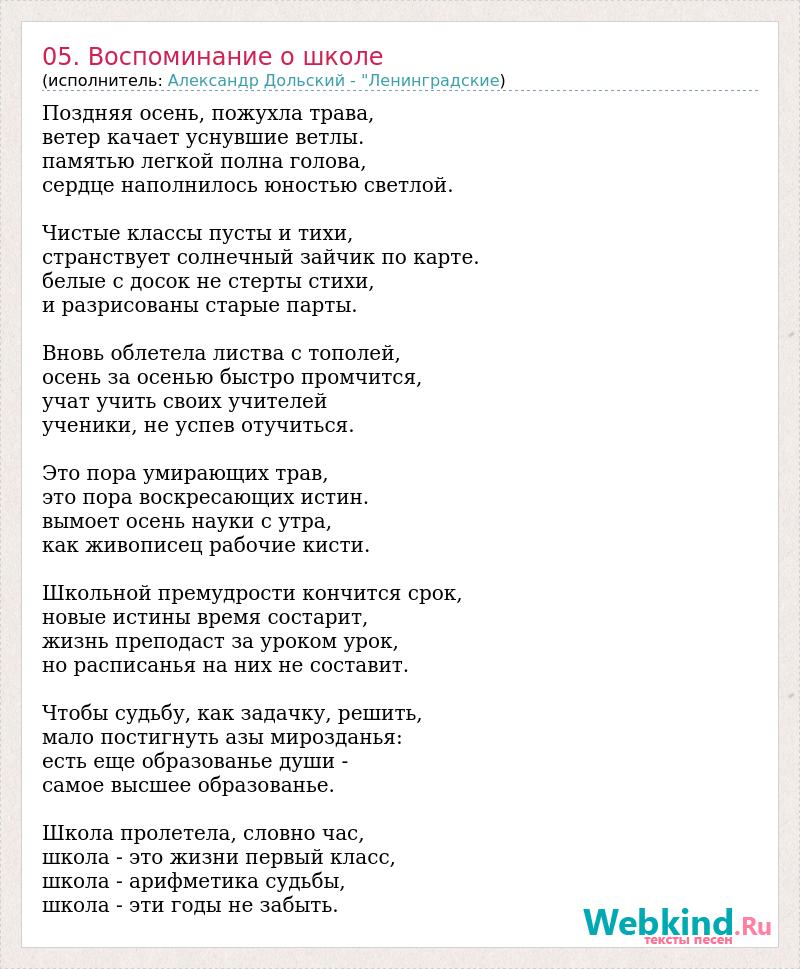 Поздняя осень, пожухла трава, ветер качает уснувшие ветлы. памятью легкой полна голова, сердце наполнилось юностью светлой. Чистые классы пусты и тихи, странствует солнечный зайчик по карте. белые с досок не стерты стихи, и разрисованы старые парты. Вновь облетела листва с тополей, осень за осенью быстро промчится, учат учить своих учителей ученики, не успев отучиться. Это пора умирающих трав, это пора воскресающих истин. вымоет осень науки с утра, как живописец рабочие кисти. Школьной премудрости кончится срок, новые истины время состарит, жизнь преподаст за уроком урок, но расписанья на них не составит. Чтобы судьбу, как задачку, решить, мало постигнуть азы мирозданья: есть еще образованье души - самое высшее образованье. Школа пролетела, словно час, школа - это жизни первый класс, школа - арифметика судьбы, школа - эти годы не забыть.