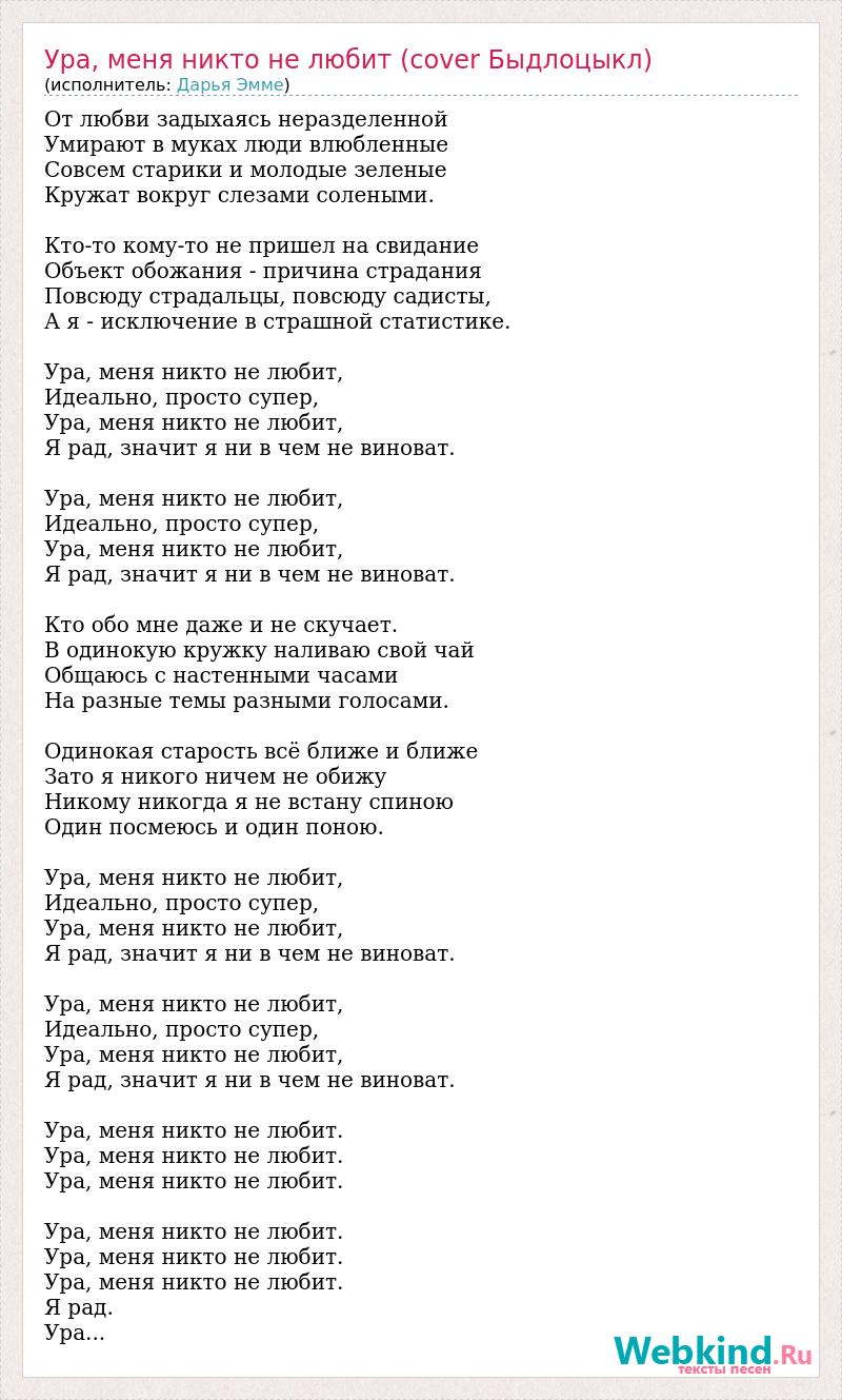 От любви задыхаясь неразделенной Умирают в муках люди влюбленные Совсем старики и молодые зеленые Кружат вокруг слезами солеными. Кто-то кому-то не пришел на свидание Объект обожания - причина страдания Повсюду страдальцы, повсюду садисты, А я - исключение в страшной статистике. Ура, меня никто не любит, Идеально, просто супер, Ура, меня никто не любит, Я рад, значит я ни в чем не виноват. Ура, меня никто не любит, Идеально, просто супер, Ура, меня никто не любит, Я рад, значит я ни в чем не виноват. Кто обо мне даже и не скучает. В одинокую кружку наливаю свой чай Общаюсь с настенными часами На разные темы разными голосами. Одинокая старость всё ближе и ближе Зато я никого ничем не обижу Никому никогда я не встану спиною Один посмеюсь и один поною. Ура, меня никто не любит, Идеально, просто супер, Ура, меня никто не любит, Я рад, значит я ни в чем не виноват. Ура, меня никто не любит, Идеально, просто супер, Ура, меня никто не любит, Я рад, значит я ни в чем не виноват. Ура, меня никто не любит. Ура, меня никто не любит. Ура, меня никто не любит. Ура, меня никто не любит. Ура, меня никто не любит. Ура, меня никто не любит. Я рад. Ура...