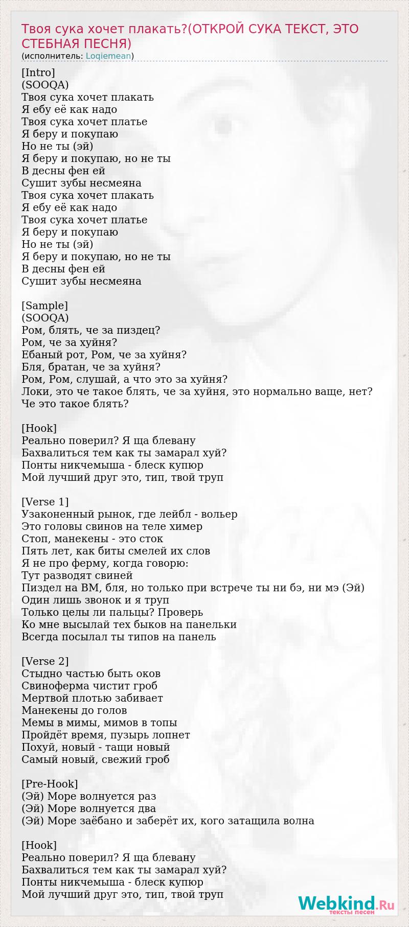 [Intro] (SOOQA) Твоя сука хочет плакать Я ебу её как надо Твоя сука хочет платье Я беру и покупаю Но не ты (эй) Я беру и покупаю, но не ты В десны фен ей Сушит зубы несмеяна Твоя сука хочет плакать Я ебу её как надо Твоя сука хочет платье Я беру и покупаю Но не ты (эй) Я беру и покупаю, но не ты В десны фен ей Сушит зубы несмеяна [Sample] (SOOQA) Ром, блять, че за пиздец? Ром, че за хуйня? Ебаный рот, Ром, че за хуйня? Бля, братан, че за хуйня? Ром, Ром, слушай, а что это за хуйня? Локи, это че такое блять, че за хуйня, это нормально ваще, нет? Че это такое блять? [Hook] Реально поверил? Я ща блевану Бахвалиться тем как ты замарал хуй? Понты никчемыша - блеск купюр Мой лучший друг это, тип, твой труп [Verse 1] Узаконенный рынок, где лейбл - вольер Это головы свинов на теле химер Стоп, манекены - это сток Пять лет, как биты смелей их слов Я не про ферму, когда говорю: Тут разводят свиней Пиздел на BM, бля, но только при встрече ты ни бэ, ни мэ (Эй) Один лишь звонок и я труп Только целы ли пальцы? Проверь Ко мне высылай тех быков на панельки Всегда посылал ты типов на панель [Verse 2] Стыдно частью быть оков Свиноферма чистит гроб Мертвой плотью забивает Манекены до голов Мемы в мимы, мимов в топы Пройдёт время, пузырь лопнет Похуй, новый - тащи новый Самый новый, свежий гроб [Pre-Hook] (Эй) Море волнуется раз (Эй) Море волнуется два (Эй) Море заёбано и заберёт их, кого затащила волна [Hook] Реально поверил? Я ща блевану Бахвалиться тем как ты замарал хуй? Понты никчемыша - блеск купюр Мой лучший друг это, тип, твой труп