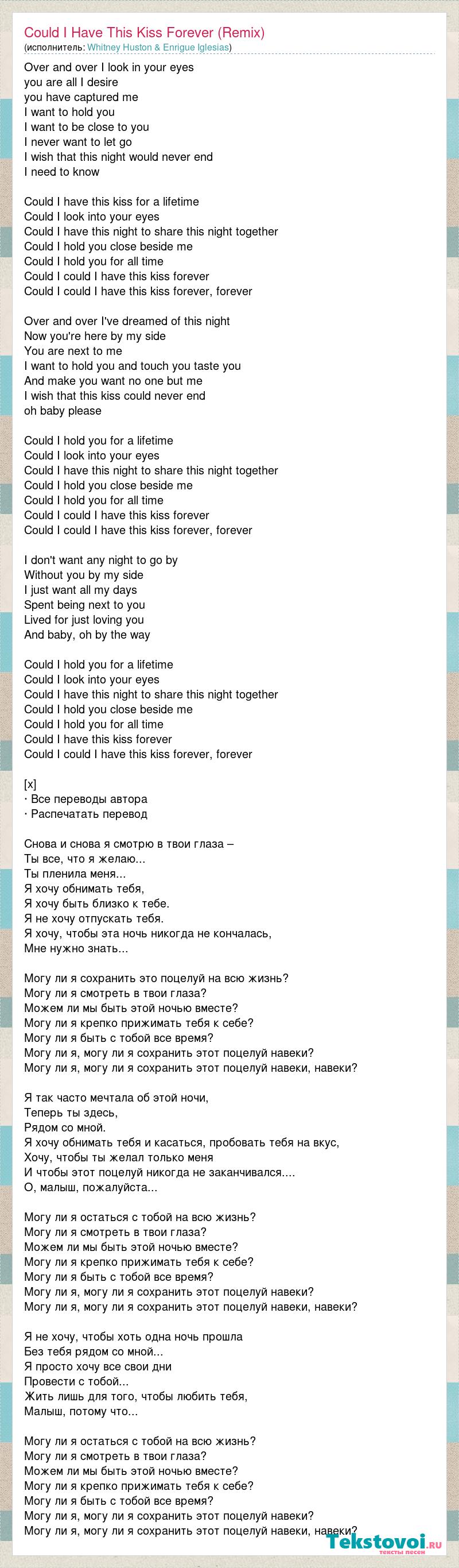 Over and over I look in your eyes you are all I desire you have captured me I want to hold you I want to be close to you I never want to let go I wish that this night would never end I need to know Could I have this kiss for a lifetime Could I look into your eyes Could I have this night to share this night together Could I hold you close beside me Could I hold you for all time Could I could I have this kiss forever Could I could I have this kiss forever, forever Over and over I've dreamed of this night Now you're here by my side You are next to me I want to hold you and touch you taste you And make you want no one but me I wish that this kiss could never end oh baby please Could I hold you for a lifetime Could I look into your eyes Could I have this night to share this night together Could I hold you close beside me Could I hold you for all time Could I could I have this kiss forever Could I could I have this kiss forever, forever I don't want any night to go by Without you by my side I just want all my days Spent being next to you Lived for just loving you And baby, oh by the way Could I hold you for a lifetime Could I look into your eyes Could I have this night to share this night together Could I hold you close beside me Could I hold you for all time Could I have this kiss forever Could I could I have this kiss forever, forever [x] · Все переводы автора · Распечатать перевод Снова и снова я смотрю в твои глаза – Ты все, что я желаю... Ты пленила меня... Я хочу обнимать тебя, Я хочу быть близко к тебе. Я не хочу отпускать тебя. Я хочу, чтобы эта ночь никогда не кончалась, Мне нужно знать... Могу ли я сохранить это поцелуй на всю жизнь? Могу ли я смотреть в твои глаза? Можем ли мы быть этой ночью вместе? Могу ли я крепко прижимать тебя к себе? Могу ли я быть с тобой все время? Могу ли я, могу ли я сохранить этот поцелуй навеки? Могу ли я, могу ли я сохранить этот поцелуй навеки, навеки? Я так часто мечтала об этой ночи, Теперь ты здесь, Рядом со мной. Я хочу обнимать тебя и касаться, пробовать тебя на вкус, Хочу, чтобы ты желал только меня И чтобы этот поцелуй никогда не заканчивался.... О, малыш, пожалуйста... Могу ли я остаться с тобой на всю жизнь? Могу ли я смотреть в твои глаза? Можем ли мы быть этой ночью вместе? Могу ли я крепко прижимать тебя к себе? Могу ли я быть с тобой все время? Могу ли я, могу ли я сохранить этот поцелуй навеки? Могу ли я, могу ли я сохранить этот поцелуй навеки, навеки? Я не хочу, чтобы хоть одна ночь прошла Без тебя рядом со мной... Я просто хочу все свои дни Провести с тобой... Жить лишь для того, чтобы любить тебя, Малыш, потому что... Могу ли я остаться с тобой на всю жизнь? Могу ли я смотреть в твои глаза? Можем ли мы быть этой ночью вместе? Могу ли я крепко прижимать тебя к себе? Могу ли я быть с тобой все время? Могу ли я, могу ли я сохранить этот поцелуй навеки? Могу ли я, могу ли я сохранить этот поцелуй навеки, навеки?