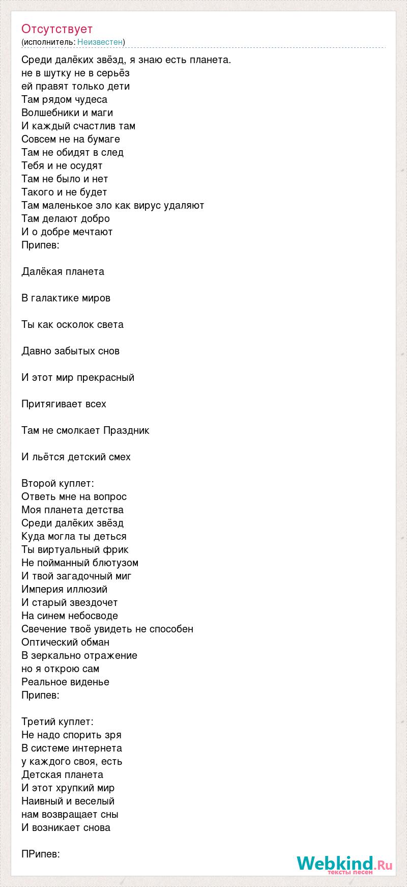 Среди далёких звёзд, я знаю есть планета. не в шутку не в серьёз ей правят только дети Там рядом чудеса Волшебники и маги И каждый счастлив там Совсем не на бумаге Там не обидят в след Тебя и не осудят Там не было и нет Такого и не будет Там маленькое зло как вирус удаляют Там делают добро И о добре мечтают Припев: Далёкая планета В галактике миров Ты как осколок света Давно забытых снов И этот мир прекрасный Притягивает всех Там не смолкает Праздник И льётся детский смех Второй куплет: Ответь мне на вопрос Моя планета детства Среди далёких звёзд Куда могла ты деться Ты виртуальный фрик Не пойманный блютузом И твой загадочный миг Империя иллюзий И старый звездочет На синем небосводе Свечение твоё увидеть не способен Оптический обман В зеркально отражение но я открою сам Реальное виденье Припев: Третий куплет: Не надо спорить зря В системе интернета у каждого своя, есть Детская планета И этот хрупкий мир Наивный и веселый нам возвращает сны И возникает снова ПРипев: