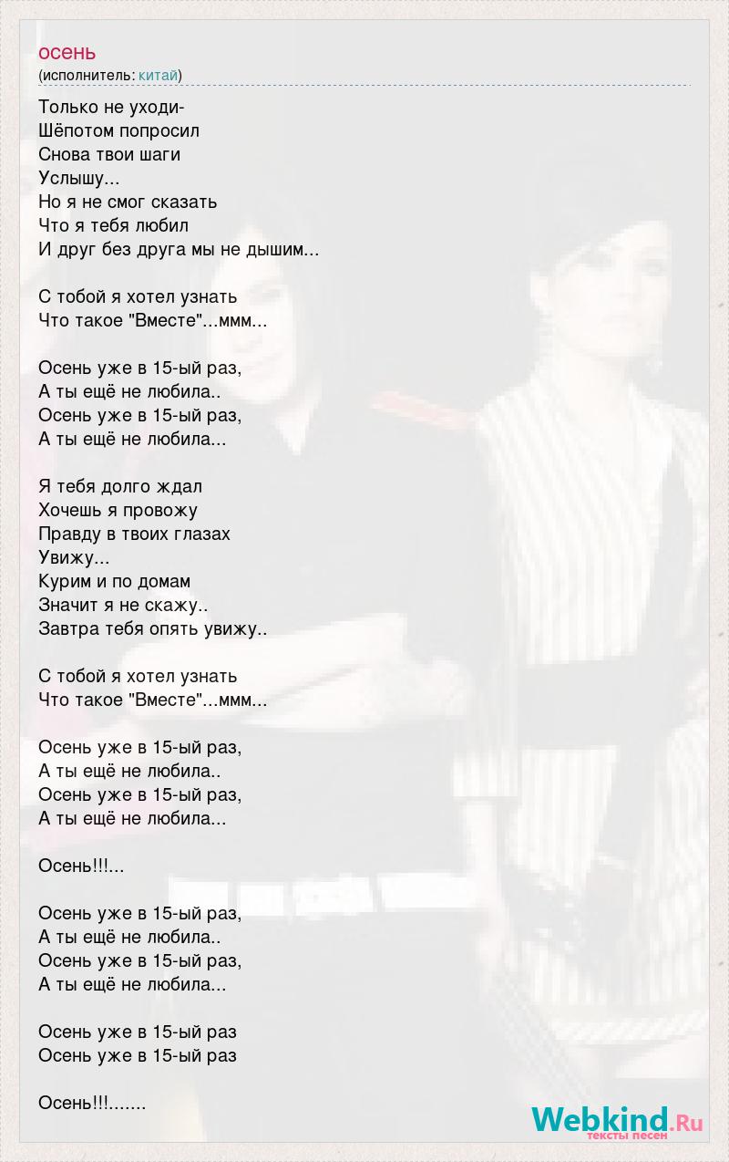 Только не уходи- Шёпотом попросил Снова твои шаги Услышу... Но я не смог сказать Что я тебя любил И друг без друга мы не дышим... С тобой я хотел узнать Что такое "Вместе"...ммм... Осень уже в 15-ый раз, А ты ещё не любила.. Осень уже в 15-ый раз, А ты ещё не любила... Я тебя долго ждал Хочешь я провожу Правду в твоих глазах Увижу... Курим и по домам Значит я не скажу.. Завтра тебя опять увижу.. С тобой я хотел узнать Что такое "Вместе"...ммм... Осень уже в 15-ый раз, А ты ещё не любила.. Осень уже в 15-ый раз, А ты ещё не любила... Осень!!!... Осень уже в 15-ый раз, А ты ещё не любила.. Осень уже в 15-ый раз, А ты ещё не любила... Осень уже в 15-ый раз Осень уже в 15-ый раз Осень!!!.......