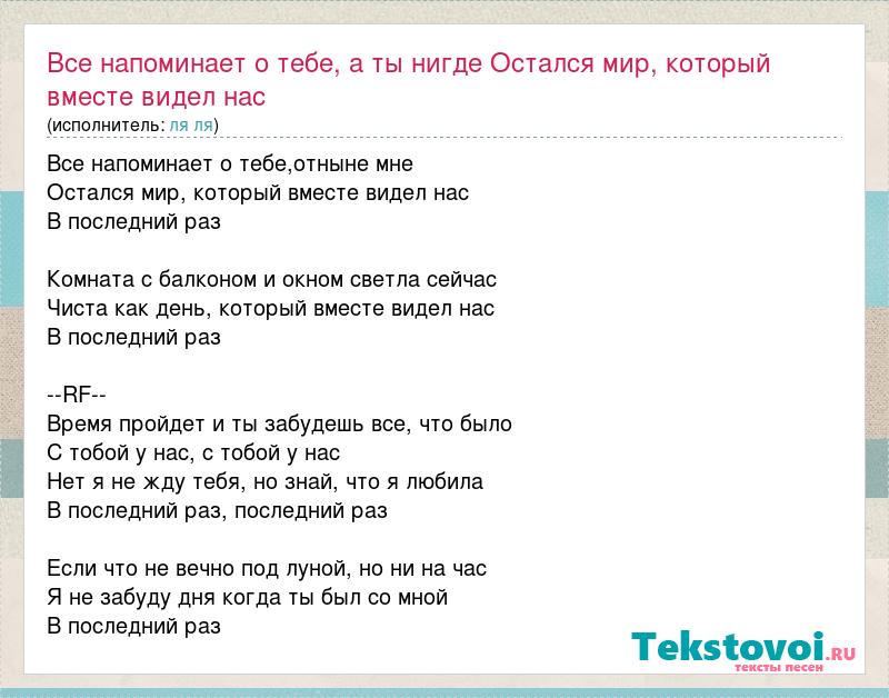 Все напоминает о тебе,отныне мне Остался мир, который вместе видел нас В последний раз Комната с балконом и окном светла сейчас Чиста как день, который вместе видел нас В последний раз --RF-- Время пройдет и ты забудешь все, что было С тобой у нас, с тобой у нас Нет я не жду тебя, но знай, что я любила В последний раз, последний раз Если что не вечно под луной, но ни на час Я не забуду дня когда ты был со мной В последний раз
