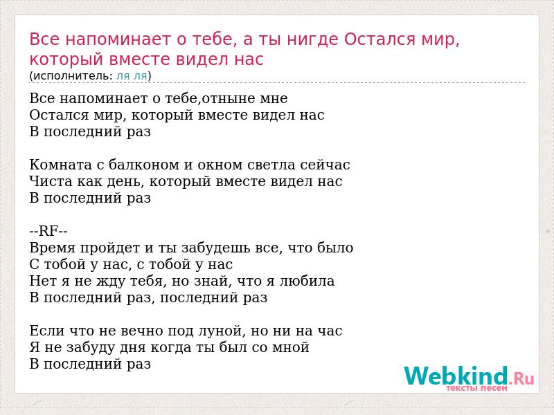 Все напоминает о тебе,отныне мне Остался мир, который вместе видел нас В последний раз Комната с балконом и окном светла сейчас Чиста как день, который вместе видел нас В последний раз --RF-- Время пройдет и ты забудешь все, что было С тобой у нас, с тобой у нас Нет я не жду тебя, но знай, что я любила В последний раз, последний раз Если что не вечно под луной, но ни на час Я не забуду дня когда ты был со мной В последний раз