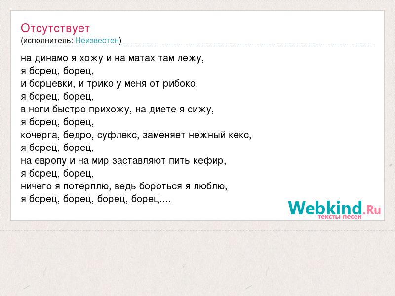 на динамо я хожу и на матах там лежу, я борец, борец, и борцевки, и трико у меня от рибоко, я борец, борец, в ноги быстро прихожу, на диете я сижу, я борец, борец, кочерга, бедро, суфлекс, заменяет нежный кекс, я борец, борец, на европу и на мир заставляют пить кефир, я борец, борец, ничего я потерплю, ведь бороться я люблю, я борец, борец, борец, борец....