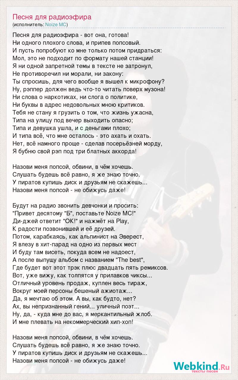 Песня для радиоэфира - вот она, готова! Ни одного плохого слова, и припев попсовый. И пусть попробуют ко мне только потом придраться: Мол, это не подходит по формату нашей станции! Я ни одной запретной темы в тексте не затронул, Не противоречил ни морали, ни закону: Ты спросишь, для чего вообще я вышел к микрофону? Ну, рэппер должен ведь что-то читать поверх музона! Ни слова о наркотиках, ни слога о политике, Ни буквы в адрес недовольных мною критиков. Тебя не стану я грузить о том, что жизнь ужасна, Типа на улицу под вечер выходить опасно; Типа и девушка ушла, и с деньгами плохо; И типа всё, что мне осталось - это ахать и охать. Нет, всё намного проще - сделав посерьёзней морду, Я бубню свой рэп под три блатных аккорда! Назови меня попсой, обвини, в чём хочешь. Слушать будешь всё равно, я же знаю точно. У пиратов купишь диск и друзьям не скажешь... Назови меня попсой - не обижусь даже! Будут на радио звонить девчонки и просить: "Привет десятому "Б", поставьте Noize MC!" Ди-джей ответит "ОК!" и нажмёт на Play, К радости позвонившей и её друзей. Потом, карабкаясь, как альпинист на Эверест, Я влезу в хит-парад на одно из первых мест И буду там висеть, покуда всем не надоест, А после выпущу альбом с названием "The best", Где будет вот этот трэк плюс двадцать пять ремиксов. Вот, уже вижу, как толпятся у прилавков чиксы... Отличный уровень продаж, куплен весь тираж, Вокруг моей персоны бешеный ажиотаж... Да, я мечтаю об этом. А вы, как будто, нет? Ах, вы непризнанный гений... уличный поэт... Ну, да, - куда мне до вас, я меркантильный жлоб. И мне плевать на некоммерческий хип-хоп! Назови меня попсой, обвини, в чём хочешь. Слушать будешь всё равно, я же знаю точно. У пиратов купишь диск и друзьям не скажешь... Назови меня попсой - не обижусь даже!