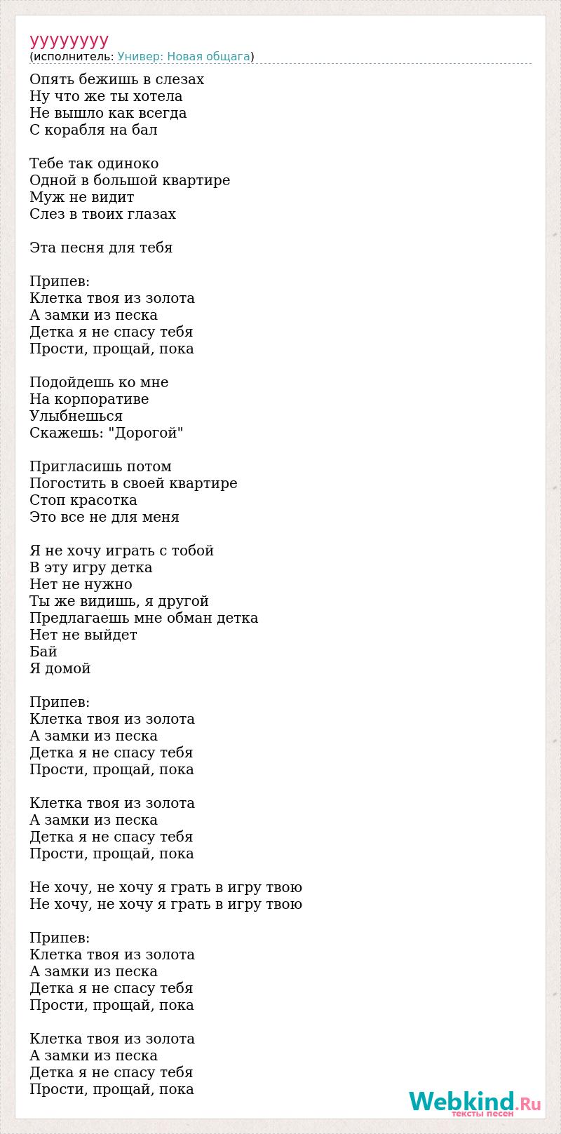 Опять бежишь в слезах Ну что же ты хотела Не вышло как всегда С корабля на бал Тебе так одиноко Одной в большой квартире Муж не видит Слез в твоих глазах Эта песня для тебя Припев: Клетка твоя из золота А замки из песка Детка я не спасу тебя Прости, прощай, пока Подойдешь ко мне На корпоративе Улыбнешься Скажешь: "Дорогой" Пригласишь потом Погостить в своей квартире Стоп красотка Это все не для меня Я не хочу играть с тобой В эту игру детка Нет не нужно Ты же видишь, я другой Предлагаешь мне обман детка Нет не выйдет Бай Я домой Припев: Клетка твоя из золота А замки из песка Детка я не спасу тебя Прости, прощай, пока Клетка твоя из золота А замки из песка Детка я не спасу тебя Прости, прощай, пока Не хочу, не хочу я грать в игру твою Не хочу, не хочу я грать в игру твою Припев: Клетка твоя из золота А замки из песка Детка я не спасу тебя Прости, прощай, пока Клетка твоя из золота А замки из песка Детка я не спасу тебя Прости, прощай, пока