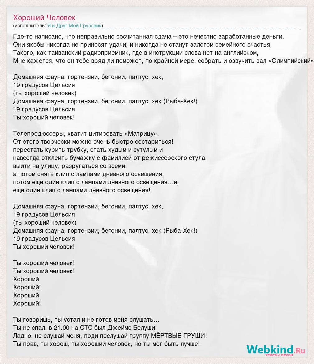 Где-то написано, что неправильно сосчитанная сдача – это нечестно заработанные деньги, Они якобы никогда не приносят удачи, и никогда не станут залогом семейного счастья, Такого, как тайванский радиоприемник, где в инструкции слова нет на английском, Мне кажется, что он тебе вряд ли поможет, по крайней мере, собрать и озвучить зал «Олимпийский» Домашняя фауна, гортензии, бегонии, палтус, хек, 19 градусов Цельсия (ты хороший человек) Домашняя фауна, гортензии, бегонии, палтус, хек (Рыба-Хек!) 19 градусов Цельсия Ты хороший человек! Телепродюссеры, хватит цитировать «Матрицу», От этого творчески можно очень быстро состариться! перестать курить трубку, стать худым и сутулым и навсегда отклеить бумажку с фамилией от режиссерского стула, выйти на улицу, разругаться со всеми, а потом снять клип с лампами дневного освещения, потом еще один клип с лампами дневного освещения…и, еще один клип с лампами дневного освещения! Домашняя фауна, гортензии, бегонии, палтус, хек, 19 градусов Цельсия (ты хороший человек) Домашняя фауна, гортензии, бегонии, палтус, хек (Рыба-Хек!) 19 градусов Цельсия Ты хороший человек! Ты хороший человек! Ты хороший человек! Хороший Хороший! Хороший Хороший! Ты говоришь, ты устал и не готов меня слушать… Ты не спал, в 21.00 на СТС был Джеймс Белуши! Ладно, не слушай меня, поди послушай группу МЁРТВЫЕ ГРУШИ! Ты прав, ты хорош, ты хороший человек, но ты мог быть лучше!