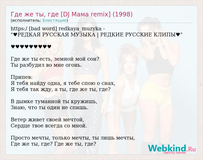 https:/ [bad word] redkaya_muzyka - "♥РЕДКАЯ РУССКАЯ МУЗЫКА | РЕДКИЕ РУССКИЕ КЛИПЫ♥" ♥♥♥♥♥♥♥♥♥ Где же ты есть, земной мой сон? Ты разбудил во мне огонь. Припев: Я тебя найду одна, я тебе спою о снах, Я тебя так жду, а ты, где же ты, где? В дымке туманной ты кружишь, Знаю, что ты один не спишь. Ветер живет своей мечтой, Сердце твое всегда со мной. Просто мечты, только мечты, ты лишь мечты, Где же ты, где? Где же ты, где?