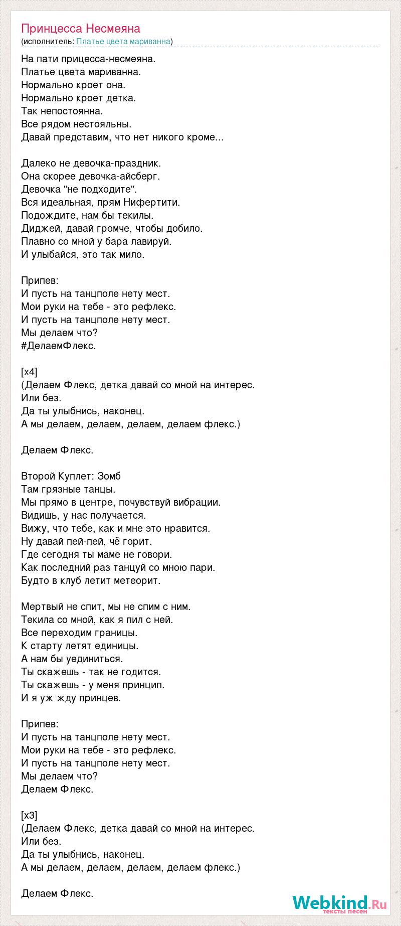 На пати прицесса-несмеяна. Платье цвета мариванна. Нормально кроет она. Нормально кроет детка. Так непостоянна. Все рядом нестояльны. Давай представим, что нет никого кроме... Далеко не девочка-праздник. Она скорее девочка-айсберг. Девочка "не подходите". Вся идеальная, прям Нифертити. Подождите, нам бы текилы. Диджей, давай громче, чтобы добило. Плавно со мной у бара лавируй. И улыбайся, это так мило. Припев: И пусть на танцполе нету мест. Мои руки на тебе - это рефлекс. И пусть на танцполе нету мест. Мы делаем что? #ДелаемФлекс. [x4] (Делаем Флекс, детка давай со мной на интерес. Или без. Да ты улыбнись, наконец. А мы делаем, делаем, делаем, делаем флекс.) Делаем Флекс. Второй Куплет: Зомб Там грязные танцы. Мы прямо в центре, почувствуй вибрации. Видишь, у нас получается. Вижу, что тебе, как и мне это нравится. Ну давай пей-пей, чё горит. Где сегодня ты маме не говори. Как последний раз танцуй со мною пари. Будто в клуб летит метеорит. Мертвый не спит, мы не спим с ним. Текила со мной, как я пил с ней. Все переходим границы. К старту летят единицы. А нам бы уединиться. Ты скажешь - так не годится. Ты скажешь - у меня принцип. И я уж жду принцев. Припев: И пусть на танцполе нету мест. Мои руки на тебе - это рефлекс. И пусть на танцполе нету мест. Мы делаем что? Делаем Флекс. [x3] (Делаем Флекс, детка давай со мной на интерес. Или без. Да ты улыбнись, наконец. А мы делаем, делаем, делаем, делаем флекс.) Делаем Флекс.