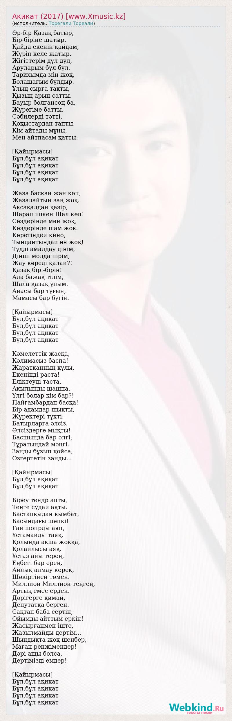 Әр-бір Қазақ батыр, Бір-біріне шатыр. Қайда екенін қайдам, Жүріп келе жатыр. Жігіттерім дүл-дүл, Аруларым бұл-бұл. Тарихымда мін жоқ, Болашағым бұлдыр. Ұлың сырға тақты, Қызың арын сатты. Бауыр болғансоң ба, Жүрегіме батты. Сәбилерді тәтті, Қоқыстардан тапты. Кім айтады мұны, Мен айтпасам қатты. [Қайырмасы] Бұл,бұл ақиқат Бұл,бұл ақиқат Бұл,бұл ақиқат Бұл,бұл ақиқат Жаза басқан жан көп, Жазалайтын заң жоқ. Ақсақалдан қазір, Шарап ішкен Шал көп! Сөздерінде мән жоқ, Көздерінде шам жоқ. Көретіндей кино, Тындайтындай ән жоқ! Түдді амалдау дінім, Дінші молда пірім, Жау көреді қалай?! Қазақ бірі-бірін! Ала бажақ тілім, Шала қазақ ұлым. Анасы бар тұғын, Мамасы бар бүгін. [Қайырмасы] Бұл,бұл ақиқат Бұл,бұл ақиқат Бұл,бұл ақиқат Бұл,бұл ақиқат Кәмелеттік жасқа, Кәлимасыз баспа! Жаратқанның құлы, Екенінді раста! Еліктеуді таста, Ақылынды шашпа. Үлгі болар кім бар?! Пайғамбардан басқа! Бір адамдар шықты, Жүректері түкті. Батырларға әлсіз, Әлсіздерге мықты! Басшында бар әлгі, Тұратындай мәңгі. Занды бұзып қойса, Өзгертетін занды... [Қайырмасы] Бұл,бұл ақиқат Бұл,бұл ақиқат Біреу тендр апты, Теңге судай ақты. Бастапқыдан қымбат, Басындағы шәпкі! Гаи шопрды аяп, Ұстамайды таяқ. Қолында ақша жоққа, Қолайлысы аяқ. Ұстаз айы терең, Еңбегі бар ерең. Айлық алмау керек, Шәкіртінен төмен. Миллион Миллион теңгең, Артық емес ерден. Дәрігерге қимай, Депутатқа берген. Сақтап баба сертін, Ойымды айттым еркін! Жасырғанмен іште, Жазылмайды дертім... Шындықта жоқ шеңбер, Маған ренжімендер! Дәрі ащы болса, Дертімізді емдер! [Қайырмасы] Бұл,бұл ақиқат Бұл,бұл ақиқат Бұл,бұл ақиқат Бұл,бұл ақиқат
