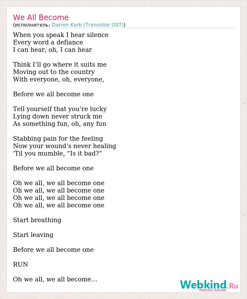 When you speak I hear silence Every word a defiance I can hear, oh, I can hear Think I’ll go where it suits me Moving out to the country With everyone, oh, everyone, Before we all become one Tell yourself that you’re lucky Lying down never struck me As something fun, oh, any fun Stabbing pain for the feeling Now your wound’s never healing 'Til you mumble, “Is it bad?” Before we all become one Oh we all, we all become one Oh we all, we all become one Oh we all, we all become one Oh we all, we all become one Start breathing Start leaving Before we all become one RUN Oh we all, we all become…