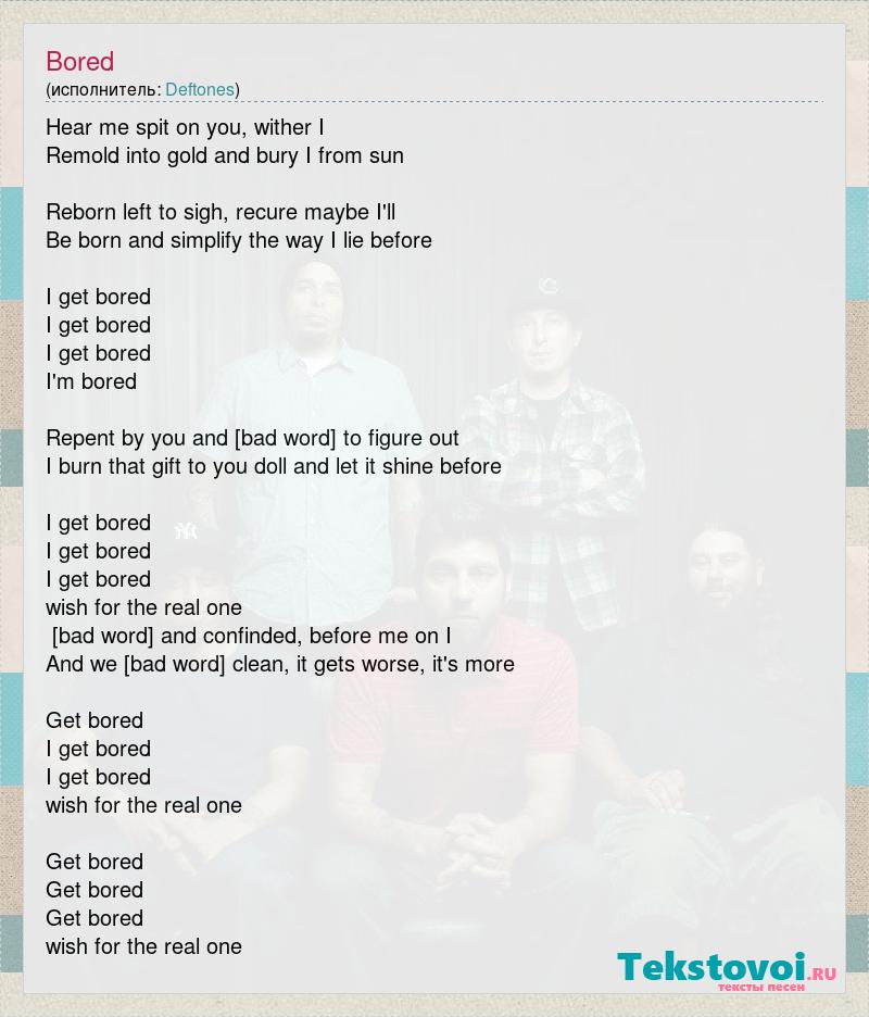 Hear me spit on you, wither I Remold into gold and bury I from sun Reborn left to sigh, recure maybe I'll Be born and simplify the way I lie before I get bored I get bored I get bored I'm bored Repent by you and trust to figure out I burn that gift to you doll and let it shine before I get bored I get bored I get bored wish for the real one [bad word] and confinded, before me on I And we will come clean, it gets worse, it's more Get bored I get bored I get bored wish for the real one Get bored Get bored Get bored wish for the real one