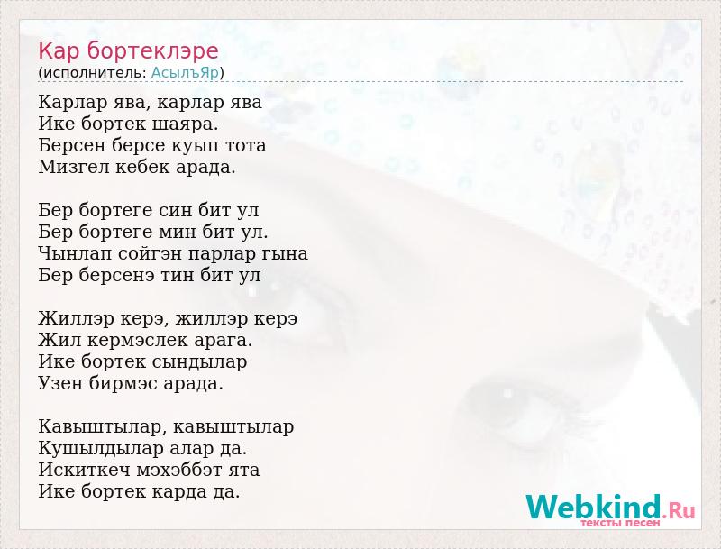 Карлар ява, карлар ява Ике бортек шаяра. Берсен берсе куып тота Мизгел кебек арада. Бер бортеге син бит ул Бер бортеге мин бит ул. Чынлап сойгэн парлар гына Бер берсенэ тин бит ул Жиллэр керэ, жиллэр керэ Жил кермэслек арага. Ике бортек сындылар Узен бирмэс арада. Кавыштылар, кавыштылар Кушылдылар алар да. Искиткеч мэхэббэт ята Ике бортек карда да.