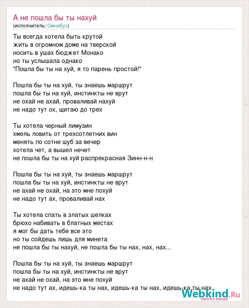 Ты всегда хотела быть крутой жить в огромном доме на тверской носить в ушах бюджет Монако но ты услышала однако "Пошла бы ты на хуй, я то парень простой!" Пошла бы ты на хуй, ты знаешь маршрут пошла бы ты на хуй, инстинкты не врут не охай не ахай, проваливай нахуй не надо тут ох, щитаю до трех Ты хотела черный лимузин хмель ловить от трехсотлетних вин менять по сотне шуб за вечер хотела чет, а вышел нечет не пошла бы ты на хуй распрекрасная Зинн-н-н Пошла бы ты на хуй, ты знаешь маршрут пошла бы ты на хуй, инстинкты не врут не ахай не охай, на это мне похуй не надо тут ах, проваливай нах Ты хотела спать в златых шелках брюхо набивать в блатных местах я мог бы дать тебе все это но ты сойдешь лишь для минета не пошла бы ты нахуй, не пошла бы ты нах, нах, нах... Пошла бы ты на хуй, ты знаешь маршрут пошла бы ты на хуй, инстинкты не врут не ахай не охай, на это мне похуй не надо тут ах, идешь-ка ты нах, идешь-ка ты нах, идешь-ка ты нах