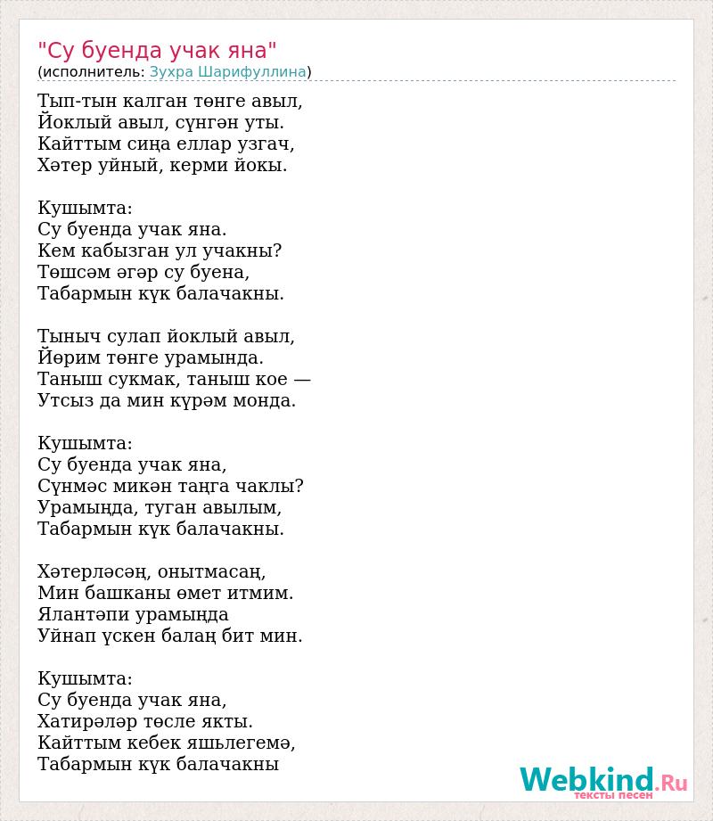 Тып-тын калган төнге авыл, Йоклый авыл, сүнгән уты. Кайттым сиңа еллар узгач, Хәтер уйный, керми йокы. Кушымта: Су буенда учак яна. Кем кабызган ул учакны? Төшсәм әгәр су буена, Табармын күк балачакны. Тыныч сулап йоклый авыл, Йөрим төнге урамында. Таныш сукмак, таныш кое — Утсыз да мин күрәм монда. Кушымта: Су буенда учак яна, Сүнмәс микән таңга чаклы? Урамыңда, туган авылым, Табармын күк балачакны. Хәтерләсәң, онытмасаң, Мин башканы өмет итмим. Ялантәпи урамыңда Уйнап үскен балаң бит мин. Кушымта: Су буенда учак яна, Хатирәләр төсле якты. Кайттым кебек яшьлегемә, Табармын күк балачакны