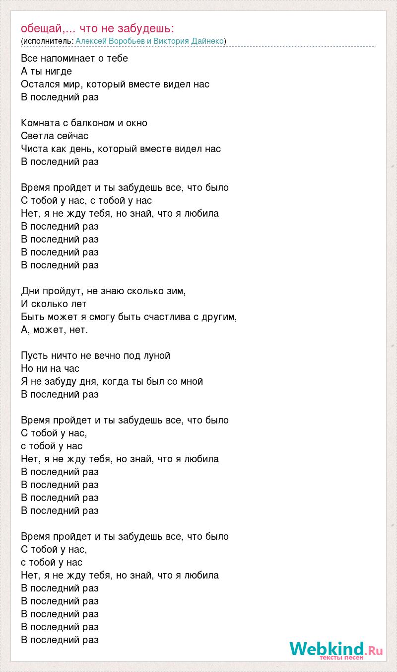 Все напоминает о тебе А ты нигде Остался мир, который вместе видел нас В последний раз Комната с балконом и окно Светла сейчас Чиста как день, который вместе видел нас В последний раз Время пройдет и ты забудешь все, что было С тобой у нас, с тобой у нас Нет, я не жду тебя, но знай, что я любила В последний раз В последний раз В последний раз В последний раз Дни пройдут, не знаю сколько зим, И сколько лет Быть может я смогу быть счастлива с другим, А, может, нет. Пусть ничто не вечно под луной Но ни на час Я не забуду дня, когда ты был со мной В последний раз Время пройдет и ты забудешь все, что было С тобой у нас, с тобой у нас Нет, я не жду тебя, но знай, что я любила В последний раз В последний раз В последний раз В последний раз Время пройдет и ты забудешь все, что было С тобой у нас, с тобой у нас Нет, я не жду тебя, но знай, что я любила В последний раз В последний раз В последний раз В последний раз В последний раз