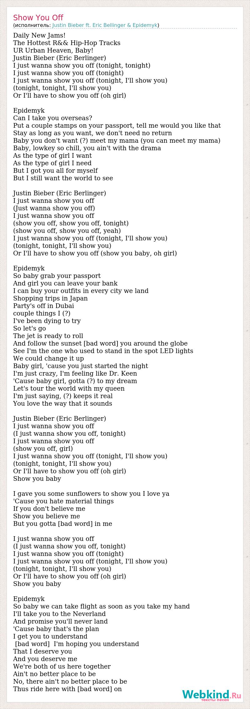 Daily New Jams! The Hottest R&& Hip-Hop Tracks UR Urban Heaven, Baby! Justin Bieber (Eric Berlinger) I just wanna show you off (tonight, tonight) I just wanna show you off (tonight) I just wanna show you off (tonight, I'll show you) (tonight, tonight, I'll show you) Or I'll have to show you off (oh girl) Epidemyk Can I take you overseas? Put a couple stamps on your passport, tell me would you like that Stay as long as you want, we don't need no return Baby you don't want (?) meet my mama (you can meet my mama) Baby, lowkey so chill, you ain't with the drama As the type of girl I want As the type of girl I need But I got you all for myself But I still want the world to see Justin Bieber (Eric Berlinger) I just wanna show you off (Just wanna show you off) I just wanna show you off (show you off, show you off, tonight) (show you off, show you off, yeah) I just wanna show you off (tonight, I'll show you) (tonight, tonight, I'll show you) Or I'll have to show you off (show you baby, oh girl) Epidemyk So baby grab your passport And girl you can leave your bank I can buy your outfits in every city we land Shopping trips in Japan Party's off in Dubai couple things I (?) I've been dying to try So let's go The jet is ready to roll And follow the sunset [bad word] you around the globe See I'm the one who used to stand in the spot LED lights We could change it up Baby girl, 'cause you just started the night I'm just crazy, I'm feeling like Dr. Keen 'Cause baby girl, gotta (?) to my dream Let's tour the world with my queen I'm just saying, (?) keeps it real You love the way that it sounds Justin Bieber (Eric Berlinger) I just wanna show you off (I just wanna show you off, tonight) I just wanna show you off (show you off, girl) I just wanna show you off (tonight, I'll show you) (tonight, tonight, I'll show you) Or I'll have to show you off (oh girl) Show you baby I gave you some sunflowers to show you I love ya 'Cause you hate material things If you don't believe me Show you believe me But you gotta [bad word] in me I just wanna show you off (I just wanna show you off, tonight) I just wanna show you off (tonight) I just wanna show you off (tonight, I'll show you) (tonight, tonight, I'll show you) Or I'll have to show you off (oh girl) Show you baby Epidemyk So baby we can take flight as soon as you take my hand I'll take you to the Neverland And promise you'll never land 'Cause baby that's the plan I get you to understand [bad word] I'm hoping you understand That I deserve you And you deserve me We're both of us here together Ain't no better place to be No, there ain't no better place to be Thus ride here with [bad word] on