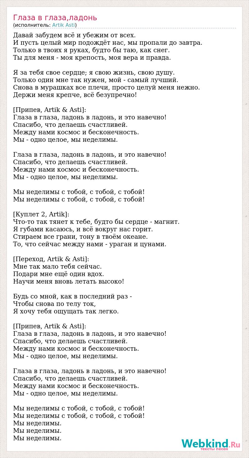 Давай забудем всё и убежим от всех. И пусть целый мир подождёт нас, мы пропали до завтра. Только в твоих я руках, будто бы таю, как снег. Ты для меня - моя крепость, моя вера и правда. Я за тебя свое сердце; я свою жизнь, свою душу. Только один мне так нужен, мой - самый лучший. Снова в мурашках все плечи, просто целуй меня нежно. Держи меня крепче, всё безупречно! [Припев, Artik & Asti]: Глаза в глаза, ладонь в ладонь, и это навечно! Спасибо, что делаешь счастливей. Между нами космос и бесконечность. Мы - одно целое, мы неделимы. Глаза в глаза, ладонь в ладонь, и это навечно! Спасибо, что делаешь счастливей. Между нами космос и бесконечность. Мы - одно целое, мы неделимы. Мы неделимы с тобой, с тобой, с тобой! Мы неделимы с тобой, с тобой, с тобой! [Куплет 2, Artik]: Что-то так тянет к тебе, будто бы сердце - магнит. Я губами касаюсь, и всё вокруг нас горит. Стираем все грани, тону в твоём океане. То, что сейчас между нами - ураган и цунами. [Переход, Artik & Asti]: Мне так мало тебя сейчас. Подари мне ещё один вдох. Научи меня вновь летать высоко! Будь со мной, как в последний раз - Чтобы снова по телу ток, Я хочу тебя ощущать так легко. [Припев, Artik & Asti]: Глаза в глаза, ладонь в ладонь, и это навечно! Спасибо, что делаешь счастливей. Между нами космос и бесконечность. Мы - одно целое, мы неделимы. Глаза в глаза, ладонь в ладонь, и это навечно! Спасибо, что делаешь счастливей. Между нами космос и бесконечность. Мы - одно целое, мы неделимы. Мы неделимы с тобой, с тобой, с тобой! Мы неделимы с тобой, с тобой, с тобой! Мы неделимы. Мы неделимы. Мы неделимы.