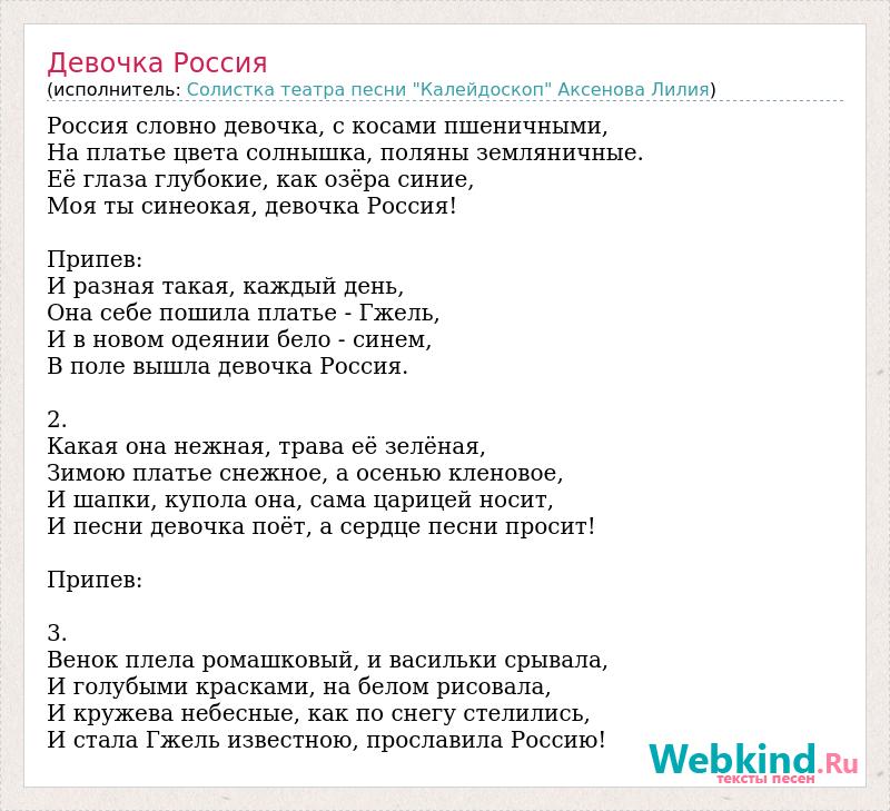 Россия словно девочка, с косами пшеничными, На платье цвета солнышка, поляны земляничные. Её глаза глубокие, как озёра синие, Моя ты синеокая, девочка Россия! Припев: И разная такая, каждый день, Она себе пошила платье - Гжель, И в новом одеянии бело - синем, В поле вышла девочка Россия. 2. Какая она нежная, трава её зелёная, Зимою платье снежное, а осенью кленовое, И шапки, купола она, сама царицей носит, И песни девочка поёт, а сердце песни просит! Припев: 3. Венок плела ромашковый, и васильки срывала, И голубыми красками, на белом рисовала, И кружева небесные, как по снегу стелились, И стала Гжель известною, прославила Россию!