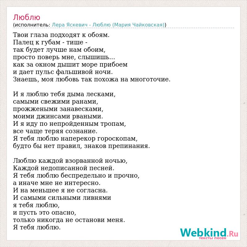 Твои глаза подходят к обоям. Палец к губам - тише - так будет лучше нам обоим, просто поверь мне, слышишь... как за окном дышит море прибоем и дает пульс фальшивой ночи. Знаешь, моя любовь так похожа на многоточие. И я люблю тебя дыма лесками, самыми свежими ранами, прожжеными занавесками, моими джинсами рваными. И я иду по непройденным тропам, все чаще теряя сознание. Я тебя люблю наперекор гороскопам, будто бы нет правил, знаков препинания. Люблю каждой взорванной ночью, Каждой недописанной песней. Я тебя люблю беспредельно и прочно, а иначе мне не интересно. И на меньшее я не согласна. И самыми сильными ливнями я тебя люблю, и пусть это опасно, только никогда не останови меня. Я тебя люблю.
