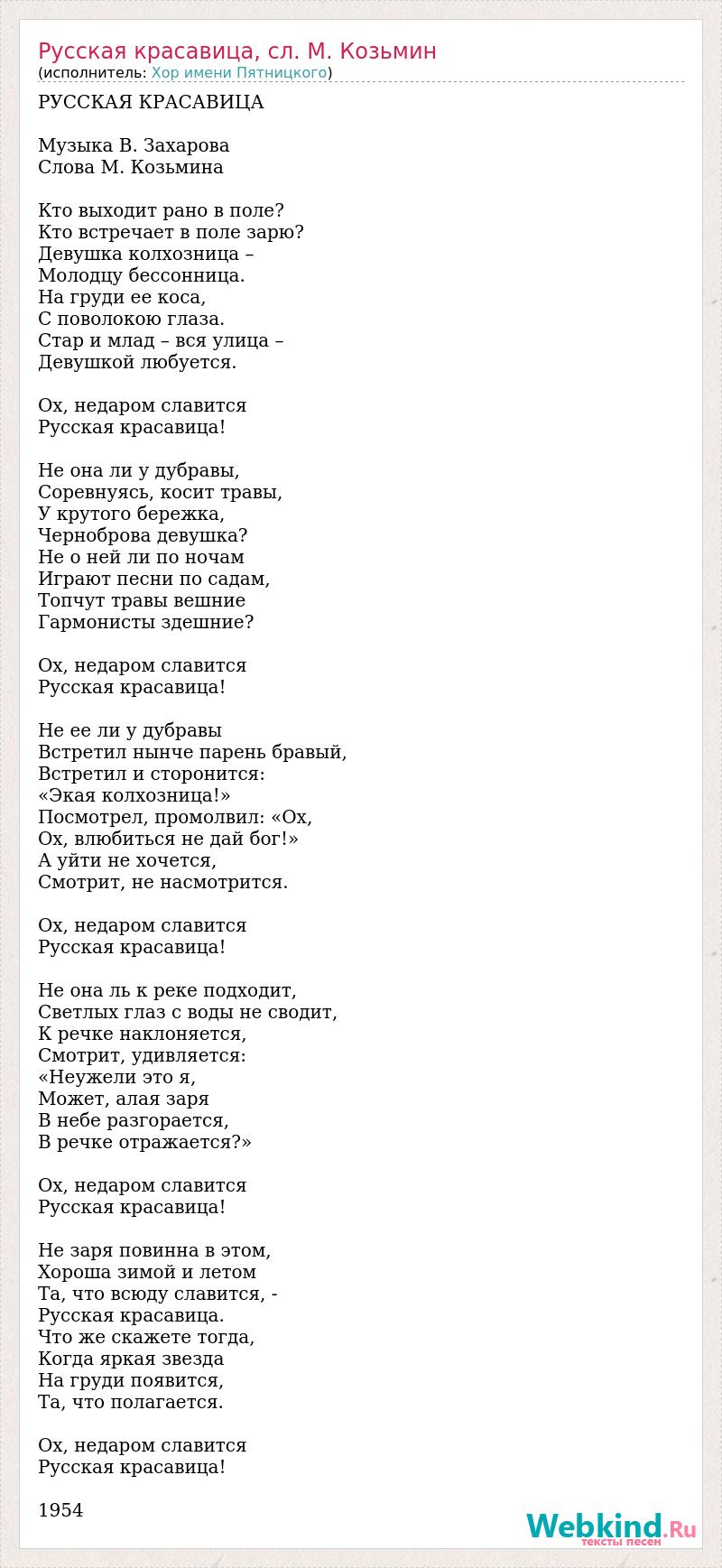 А как ты думаешь, о чем песня "Русская красавица, сл. М. Козьмин" ?