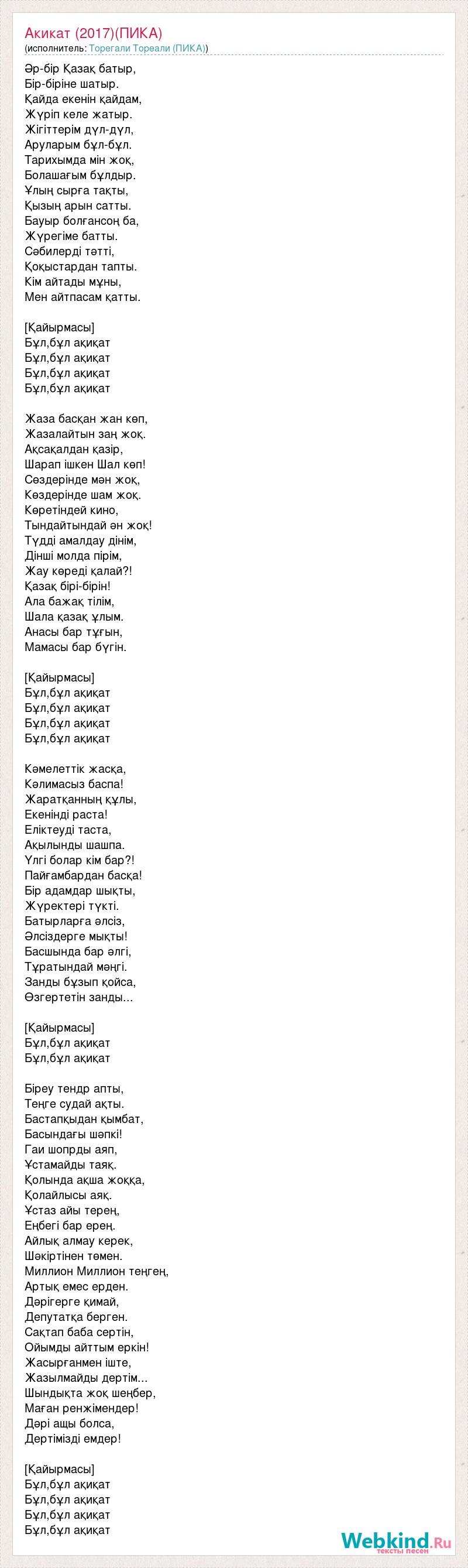 Әр-бір Қазақ батыр, Бір-біріне шатыр. Қайда екенін қайдам, Жүріп келе жатыр. Жігіттерім дүл-дүл, Аруларым бұл-бұл. Тарихымда мін жоқ, Болашағым бұлдыр. Ұлың сырға тақты, Қызың арын сатты. Бауыр болғансоң ба, Жүрегіме батты. Сәбилерді тәтті, Қоқыстардан тапты. Кім айтады мұны, Мен айтпасам қатты. [Қайырмасы] Бұл,бұл ақиқат Бұл,бұл ақиқат Бұл,бұл ақиқат Бұл,бұл ақиқат Жаза басқан жан көп, Жазалайтын заң жоқ. Ақсақалдан қазір, Шарап ішкен Шал көп! Сөздерінде мән жоқ, Көздерінде шам жоқ. Көретіндей кино, Тындайтындай ән жоқ! Түдді амалдау дінім, Дінші молда пірім, Жау көреді қалай?! Қазақ бірі-бірін! Ала бажақ тілім, Шала қазақ ұлым. Анасы бар тұғын, Мамасы бар бүгін. [Қайырмасы] Бұл,бұл ақиқат Бұл,бұл ақиқат Бұл,бұл ақиқат Бұл,бұл ақиқат Кәмелеттік жасқа, Кәлимасыз баспа! Жаратқанның құлы, Екенінді раста! Еліктеуді таста, Ақылынды шашпа. Үлгі болар кім бар?! Пайғамбардан басқа! Бір адамдар шықты, Жүректері түкті. Батырларға әлсіз, Әлсіздерге мықты! Басшында бар әлгі, Тұратындай мәңгі. Занды бұзып қойса, Өзгертетін занды... [Қайырмасы] Бұл,бұл ақиқат Бұл,бұл ақиқат Біреу тендр апты, Теңге судай ақты. Бастапқыдан қымбат, Басындағы шәпкі! Гаи шопрды аяп, Ұстамайды таяқ. Қолында ақша жоққа, Қолайлысы аяқ. Ұстаз айы терең, Еңбегі бар ерең. Айлық алмау керек, Шәкіртінен төмен. Миллион Миллион теңгең, Артық емес ерден. Дәрігерге қимай, Депутатқа берген. Сақтап баба сертін, Ойымды айттым еркін! Жасырғанмен іште, Жазылмайды дертім... Шындықта жоқ шеңбер, Маған ренжімендер! Дәрі ащы болса, Дертімізді емдер! [Қайырмасы] Бұл,бұл ақиқат Бұл,бұл ақиқат Бұл,бұл ақиқат Бұл,бұл ақиқат