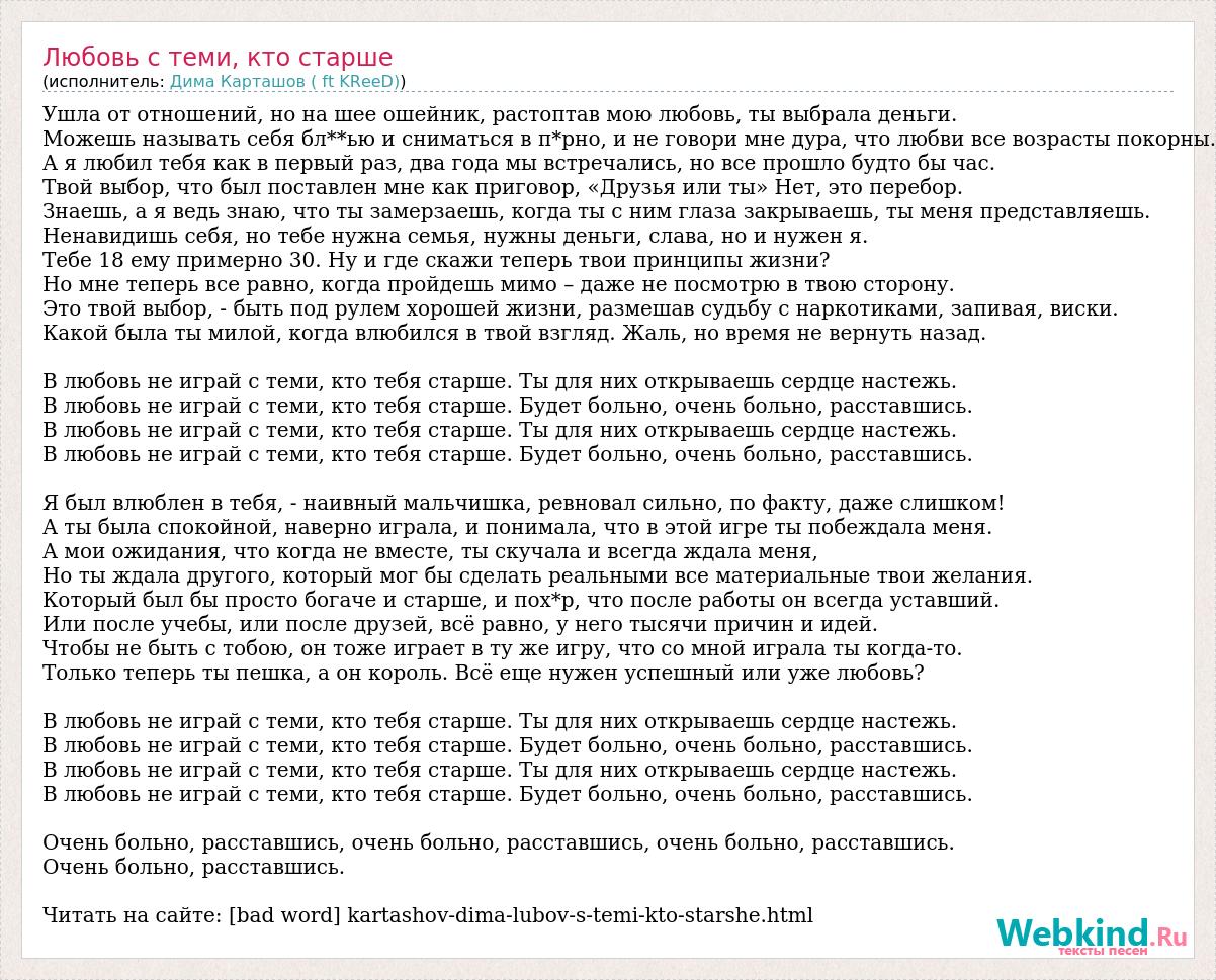 Ушла от отношений, но на шее ошейник, растоптав мою любовь, ты выбрала деньги. Можешь называть себя бл**ью и сниматься в п*рно, и не говори мне дура, что любви все возрасты покорны. А я любил тебя как в первый раз, два года мы встречались, но все прошло будто бы час. Твой выбор, что был поставлен мне как приговор, «Друзья или ты» Нет, это перебор. Знаешь, а я ведь знаю, что ты замерзаешь, когда ты с ним глаза закрываешь, ты меня представляешь. Ненавидишь себя, но тебе нужна семья, нужны деньги, слава, но и нужен я. Тебе 18 ему примерно 30. Ну и где скажи теперь твои принципы жизни? Но мне теперь все равно, когда пройдешь мимо – даже не посмотрю в твою сторону. Это твой выбор, - быть под рулем хорошей жизни, размешав судьбу с наркотиками, запивая, виски. Какой была ты милой, когда влюбился в твой взгляд. Жаль, но время не вернуть назад. В любовь не играй с теми, кто тебя старше. Ты для них открываешь сердце настежь. В любовь не играй с теми, кто тебя старше. Будет больно, очень больно, расставшись. В любовь не играй с теми, кто тебя старше. Ты для них открываешь сердце настежь. В любовь не играй с теми, кто тебя старше. Будет больно, очень больно, расставшись. Я был влюблен в тебя, - наивный мальчишка, ревновал сильно, по факту, даже слишком! А ты была спокойной, наверно играла, и понимала, что в этой игре ты побеждала меня. А мои ожидания, что когда не вместе, ты скучала и всегда ждала меня, Но ты ждала другого, который мог бы сделать реальными все материальные твои желания. Который был бы просто богаче и старше, и пох*р, что после работы он всегда уставший. Или после учебы, или после друзей, всё равно, у него тысячи причин и идей. Чтобы не быть с тобою, он тоже играет в ту же игру, что со мной играла ты когда-то. Только теперь ты пешка, а он король. Всё еще нужен успешный или уже любовь? В любовь не играй с теми, кто тебя старше. Ты для них открываешь сердце настежь. В любовь не играй с теми, кто тебя старше. Будет больно, очень больно, расставшись. В любовь не играй с теми, кто тебя старше. Ты для них открываешь сердце настежь. В любовь не играй с теми, кто тебя старше. Будет больно, очень больно, расставшись. Очень больно, расставшись, очень больно, расставшись, очень больно, расставшись. Очень больно, расставшись. Читать на сайте: [bad word] kartashov-dima-lubov-s-temi-kto-starshe.html
