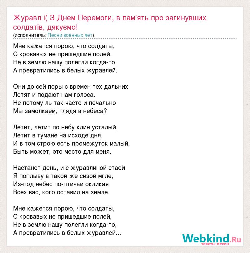 Мне кажется порою, что солдаты, С кровавых не пришедшие полей, Не в землю нашу полегли когда-то, А превратились в белых журавлей. Они до сей поры с времен тех дальних Летят и подают нам голоса. Не потому ль так часто и печально Мы замолкаем, глядя в небеса? Летит, летит по небу клин усталый, Летит в тумане на исходе дня, И в том строю есть промежуток малый, Быть может, это место для меня. Настанет день, и с журавлиной стаей Я поплыву в такой же сизой мгле, Из-под небес по-птичьи окликая Всех вас, кого оставил на земле. Мне кажется порою, что солдаты, С кровавых не пришедшие полей, Не в землю нашу полегли когда-то, А превратились в белых журавлей...