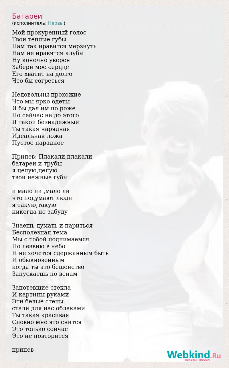 Мой прокуренный голос Твои теплые губы Нам так нравится мерзнуть Нам не нравятся клубы Ну конечно уверен Забери мое сердце Его хватит на долго Что бы согреться Недовольны прохожие Что мы ярко одеты Я бы дал им по роже Но сейчас не до этого Я такой безнадежный Ты такая нарядная Идеальная ложа Пустое парадное Припев: Плакали,плакали батареи и трубы я целую,целую твои нежные губы и мало ли ,мало ли что подумают люди я такую,такую никогда не забуду Знаешь думать и париться Бесполезная тема Мы с тобой поднимаемся По лезвию в небо И не хочется сдержанным быть И обыкновенным когда ты это бешенство Запускаешь по венам Запотевшие стекла И картины руками Эти белые стены стали для нас облаками Ты такая красивая Словно мне это снится Это только сейчас Это не повторится припев