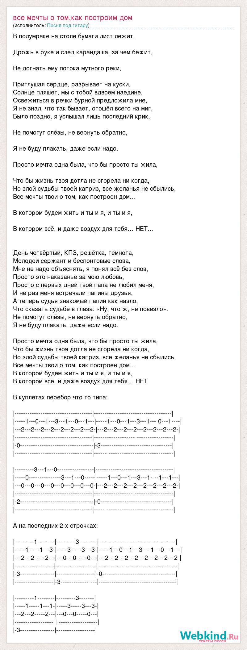 В полумраке на столе бумаги лист лежит, Дрожь в руке и след карандаша, за чем бежит, Не догнать ему потока мутного реки, Приглушая сердце, разрывает на куски, Солнце пляшет, мы с тобой вдвоем наедине, Освежиться в речки бурной предложила мне, Я не знал, что так бывает, отошёл всего на миг, Было поздно, я услышал лишь последний крик, Не помогут слёзы, не вернуть обратно, Я не буду плакать, даже если надо. Просто мечта одна была, что бы просто ты жила, Что бы жизнь твоя дотла не сгорела ни когда, Но злой судьбы твоей каприз, все желанья не сбылись, Все мечты твои о том, как построен дом… В котором будем жить и ты и я, и ты и я, В котором всё, и даже воздух для тебя… НЕТ… День четвёртый, КПЗ, решётка, темнота, Молодой сержант и беспонтовые слова, Мне не надо объяснять, я понял всё без слов, Просто это наказанье за мою любовь, Просто с первых дней твой папа не любил меня, И не раз меня встречали папины друзья, А теперь судья знакомый папин как назло, Что сказать судьбе в глаза: «Ну, что ж, не повезло». Не помогут слёзы, не вернуть обратно, Я не буду плакать, даже если надо. Просто мечта одна была, что бы просто ты жила, Что бы жизнь твоя дотла не сгорела ни когда, Но злой судьбы твоей каприз, все желанья не сбылись, Все мечты твои о том, как построен дом… В котором будем жить и ты и я, и ты и я, В котором всё, и даже воздух для тебя… НЕТ В куплетах перебор что то типа: |------------------------------------|------------------------------------| |-----1---0---1---3---1---0---1---|-----1---0---1---3---1--- 0---1----| |---2---2---2---2---2---2---2---2-|---2---2---2---2---2---2---2---2-| |------------------------------------|------------------- -----------------| |-0----------------------------------|-3---------------------------------| |------------------------------------|------ ------------------------------| |---------3---1---0-----------------|------------------------------------| |-----0---------------3---1---0-----|-----1---0---1---3---1- --1---1---| |---0---0---0---0---0---0---0---0-|---2---2---2---2---2---2---2---2-| |------------------------------------|------------------ ------------------| |-2----------------------------------|-0---------------------------------| |------------------------------------|----- -------------------------------| А на последних 2-х строчках: |---------1--------|---------3--------|------------------------------------| |-----1-----1---3-|-----3-----3---3-|-----1---0---1---3--- 1---0---1---| |---2---2-----2---|---0---0-----0---|---2---2---2---2---2---2---2---2-| |------------------|-------------------|------------ ------------------------| |-3----------------|------------------|-0----------------------------------| |------------------|-3------------- ---|------------------------------------| |---------1--------|---------3-------| |-----1-----1---1-|-----3-----3---3-| |---2---2-----2---|---0---0-----0---| |------------------ | ------------------| |-3----------------|------------------|