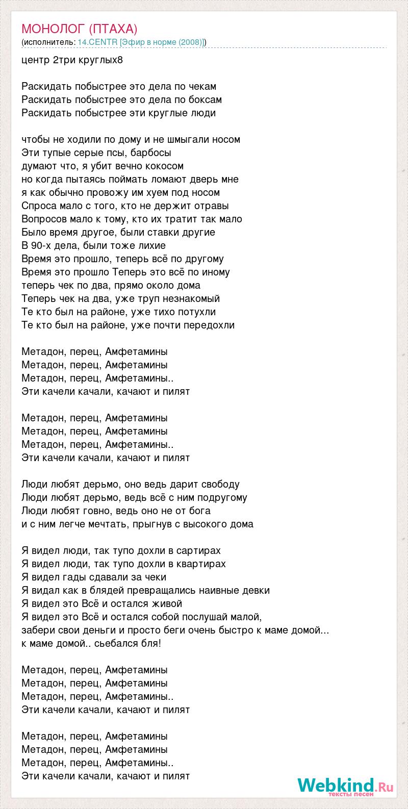 центр 2три круглых8 Раскидать побыстрее это дела по чекам Раскидать побыстрее это дела по боксам Раскидать побыстрее эти круглые люди чтобы не ходили по дому и не шмыгали носом Эти тупые серые псы, барбосы думают что, я убит вечно кокосом но когда пытаясь поймать ломают дверь мне я как обычно провожу им хуем под носом Спроса мало с того, кто не держит отравы Вопросов мало к тому, кто их тратит так мало Было время другое, были ставки другие В 90-х дела, были тоже лихие Время это прошло, теперь всё по другому Время это прошло Теперь это всё по иному теперь чек по два, прямо около дома Теперь чек на два, уже труп незнакомый Те кто был на районе, уже тихо потухли Те кто был на районе, уже почти передохли Метадон, перец, Амфетамины Метадон, перец, Амфетамины Метадон, перец, Амфетамины.. Эти качели качали, качают и пилят Метадон, перец, Амфетамины Метадон, перец, Амфетамины Метадон, перец, Амфетамины.. Эти качели качали, качают и пилят Люди любят дерьмо, оно ведь дарит свободу Люди любят дерьмо, ведь всё с ним подругому Люди любят говно, ведь оно не от бога и с ним легче мечтать, прыгнув с высокого дома Я видел люди, так тупо дохли в сартирах Я видел люди, так тупо дохли в квартирах Я видел гады сдавали за чеки Я видал как в блядей превращались наивные девки Я видел это Всё и остался живой Я видел это Всё и остался собой послушай малой, забери свои деньги и просто беги очень быстро к маме домой... к маме домой.. сьебался бля! Метадон, перец, Амфетамины Метадон, перец, Амфетамины Метадон, перец, Амфетамины.. Эти качели качали, качают и пилят Метадон, перец, Амфетамины Метадон, перец, Амфетамины Метадон, перец, Амфетамины.. Эти качели качали, качают и пилят