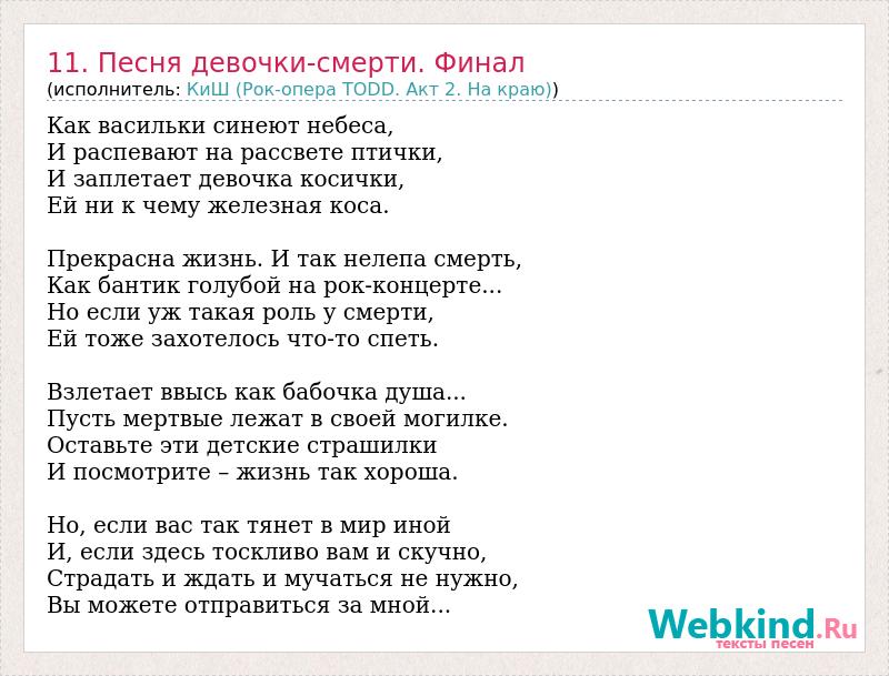 Как васильки синеют небеса, И распевают на рассвете птички, И заплетает девочка косички, Ей ни к чему железная коса. Прекрасна жизнь. И так нелепа смерть, Как бантик голубой на рок-концерте... Но если уж такая роль у смерти, Ей тоже захотелось что-то спеть. Взлетает ввысь как бабочка душа... Пусть мертвые лежат в своей могилке. Оставьте эти детские страшилки И посмотрите – жизнь так хороша. Но, если вас так тянет в мир иной И, если здесь тоскливо вам и скучно, Страдать и ждать и мучаться не нужно, Вы можете отправиться за мной...