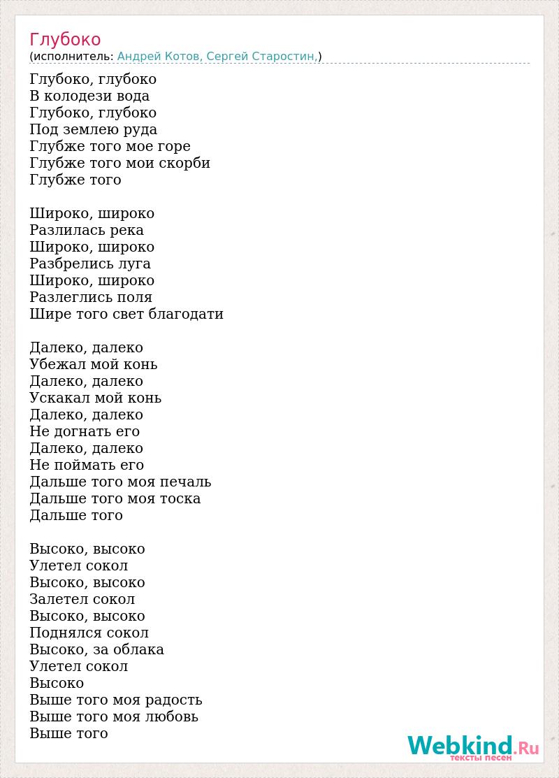 Глубоко, глубоко В колодези вода Глубоко, глубоко Под землею руда Глубже того мое горе Глубже того мои скорби Глубже того Широко, широко Разлилась река Широко, широко Разбрелись луга Широко, широко Разлеглись поля Шире того свет благодати Далеко, далеко Убежал мой конь Далеко, далеко Ускакал мой конь Далеко, далеко Не догнать его Далеко, далеко Не поймать его Дальше того моя печаль Дальше того моя тоска Дальше того Высоко, высоко Улетел сокол Высоко, высоко Залетел сокол Высоко, высоко Поднялся сокол Высоко, за облака Улетел сокол Высоко Выше того моя радость Выше того моя любовь Выше того