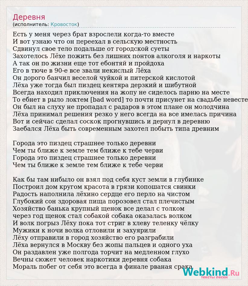 Есть у меня через брат взрослели когда-то вместе И вот узнаю что он переехал в сельскую местность Сдвинул свое тело подальше от городской суеты Захотелось Лёхе пожить без лишних понтов алкоголя и наркоты А так он по жизни еще тот ебонтяй и пройдоха Его в тюче в 90-е все звали некислый Лёха Он дорого банчил веселой чуйкой и питерской кислотой Лёха уже тогда был пиздец кентяра дерзкий и шибутной Всегда находил приключения на жопу не сиделось парню на месте То ебнет в рыло локтем [bad word] то почти присунет на свадьбе невесте Он был на слуху не пропадал с радаров в этом плане он молодчина Лёха принимал решения резко у него всегда на все имелась причина Вот и сейчас сделал соскок прогнувшись и дернул в деревню Заебался Лёха быть современным захотел побыть типа древним Города это пиздец страшнее только деревни Чем ты ближе к земле тем ближе к тебе черви Города это пиздец страшнее только деревни Чем ты ближе к земле тем ближе к тебе черви Как бы там нибыло он взял под себя куст земли в глубинке Построил дом кругом красота в грязи копошатся свинки Радость наполнила лёхино сердце его перло на чистом Глубокий сон здоровая пища порозовел стал плечистым Хозяйство банька крупный щенок все делал с толком через год щенок стал собакой собака оказалась волком И волк погрыз Лёху пока тот стриг в хлеву теленку чёлку Мужики к ночи волка отловили и захуярили Лёху отправили в город хозяйство его разграбили Лёха вернулся в Москву без жопы пальцев и одного уха Он раздавлен уже полгода торчит на медленном глухо Вечны сюжет человек наркотики деревня собака Мораль побег от себя это всегда в финале рваная срака