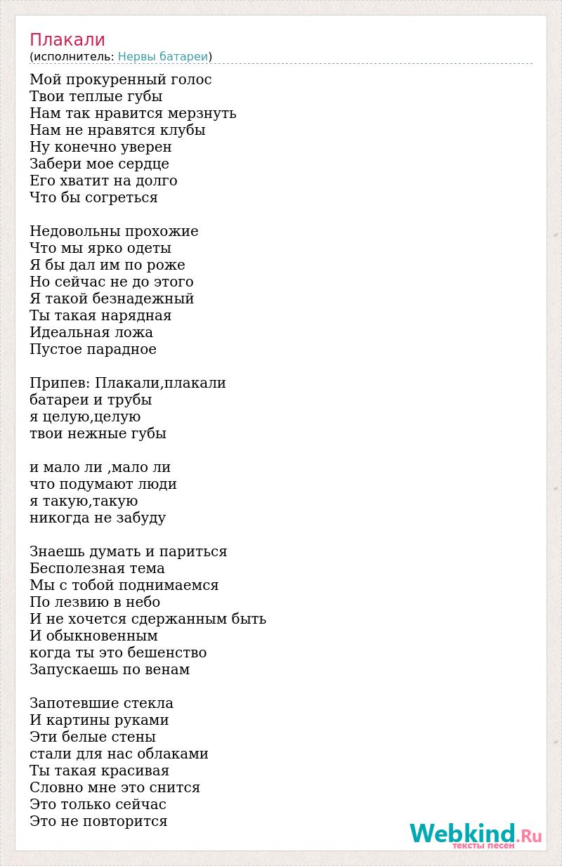 Мой прокуренный голос Твои теплые губы Нам так нравится мерзнуть Нам не нравятся клубы Ну конечно уверен Забери мое сердце Его хватит на долго Что бы согреться Недовольны прохожие Что мы ярко одеты Я бы дал им по роже Но сейчас не до этого Я такой безнадежный Ты такая нарядная Идеальная ложа Пустое парадное Припев: Плакали,плакали батареи и трубы я целую,целую твои нежные губы и мало ли ,мало ли что подумают люди я такую,такую никогда не забуду Знаешь думать и париться Бесполезная тема Мы с тобой поднимаемся По лезвию в небо И не хочется сдержанным быть И обыкновенным когда ты это бешенство Запускаешь по венам Запотевшие стекла И картины руками Эти белые стены стали для нас облаками Ты такая красивая Словно мне это снится Это только сейчас Это не повторится