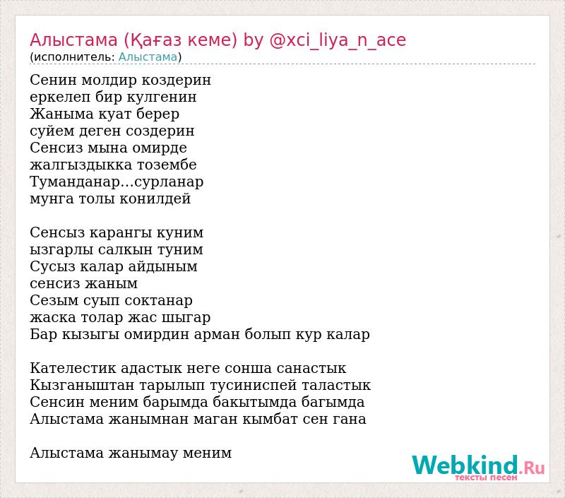 Сенин молдир коздерин еркелеп бир кулгенин Жаныма куат берер суйем деген создерин Сенсиз мына омирде жалгыздыкка тозембе Туманданар…сурланар мунга толы конилдей Сенсыз карангы куним ызгарлы салкын туним Сусыз калар айдыным сенсиз жаным Сезым суып соктанар жаска толар жас шыгар Бар кызыгы омирдин арман болып кур калар Кателестик адастык неге сонша санастык Кызганыштан тарылып тусиниспей таластык Сенсин меним барымда бакытымда багымда Алыстама жанымнан маган кымбат сен гана Алыстама жанымау меним