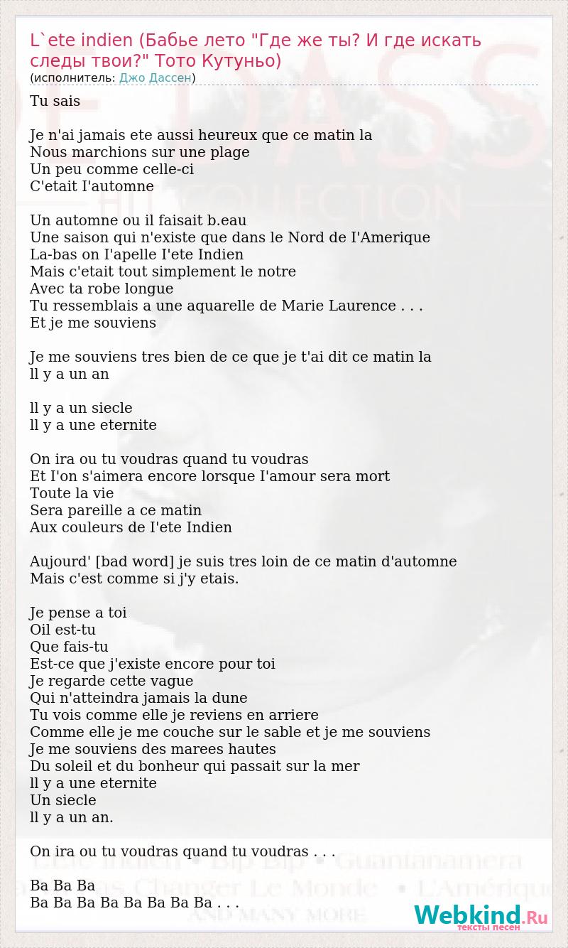 Tu sais Je n'ai jamais ete aussi heureux que ce matin la Nous marchions sur une plage Un peu comme celle-ci C'etait I'automne Un automne ou il faisait b.eau Une saison qui n'existe que dans le Nord de I'Amerique La-bas on I'apelle I'ete Indien Mais c'etait tout simplement le notre Avec ta robe longue Tu ressemblais a une aquarelle de Marie Laurence . . . Et je me souviens Je me souviens tres bien de ce que je t'ai dit ce matin la ll y a un an ll y a un siecle ll y a une eternite On ira ou tu voudras quand tu voudras Et I'on s'aimera encore lorsque I'amour sera mort Toute la vie Sera pareille a ce matin Aux couleurs de I'ete Indien Aujourd' [bad word] je suis tres loin de ce matin d'automne Mais c'est comme si j'y etais. Je pense a toi Oil est-tu Que fais-tu Est-ce que j'existe encore pour toi Je regarde cette vague Qui n'atteindra jamais la dune Tu vois comme elle je reviens en arriere Comme elle je me couche sur le sable et je me souviens Je me souviens des marees hautes Du soleil et du bonheur qui passait sur la mer ll y a une eternite Un siecle ll y a un an. On ira ou tu voudras quand tu voudras . . . Ba Ba Ba Ba Ba Ba Ba Ba Ba Ba Ba . . .