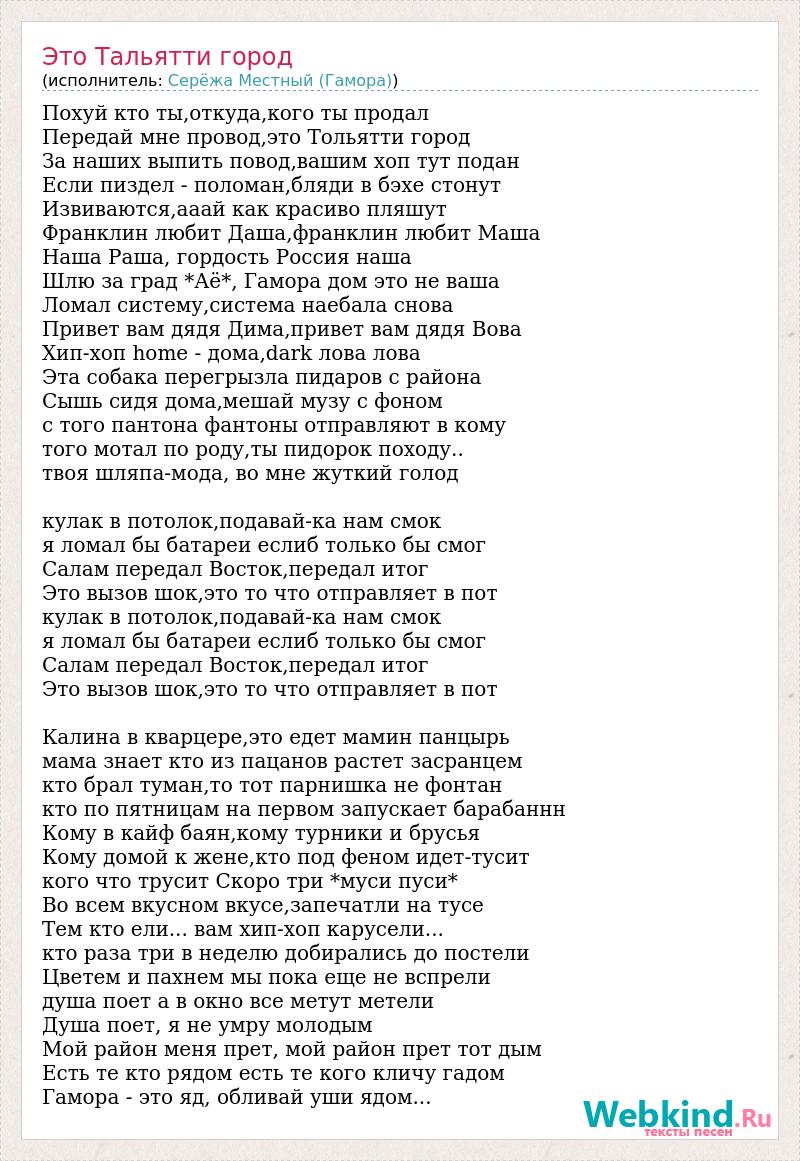 Похуй кто ты,откуда,кого ты продал Передай мне провод,это Тольятти город За наших выпить повод,вашим хоп тут подан Если пиздел - поломан,бляди в бэхе стонут Извиваются,ааай как красиво пляшут Франклин любит Даша,франклин любит Маша Наша Раша, гордость Россия наша Шлю за град *Аё*, Гамора дом это не ваша Ломал систему,система наебала снова Привет вам дядя Дима,привет вам дядя Вова Хип-хоп homе - дома,dark лова лова Эта собака перегрызла пидаров с района Сышь сидя дома,мешай музу с фоном с того пантона фантоны отправляют в кому того мотал по роду,ты пидорок походу.. твоя шляпа-мода, во мне жуткий голод кулак в потолок,подавай-ка нам смок я ломал бы батареи еслиб только бы смог Салам передал Восток,передал итог Это вызов шок,это то что отправляет в пот кулак в потолок,подавай-ка нам смок я ломал бы батареи еслиб только бы смог Салам передал Восток,передал итог Это вызов шок,это то что отправляет в пот Калина в кварцере,это едет мамин панцырь мама знает кто из пацанов растет засранцем кто брал туман,то тот парнишка не фонтан кто по пятницам на первом запускает барабаннн Кому в кайф баян,кому турники и брусья Кому домой к жене,кто под феном идет-тусит кого что трусит Скоро три *муси пуси* Во всем вкусном вкусе,запечатли на тусе Тем кто ели... вам хип-хоп карусели... кто раза три в неделю добирались до постели Цветем и пахнем мы пока еще не вспрели душа поет а в окно все метут метели Душа поет, я не умру молодым Мой район меня прет, мой район прет тот дым Есть те кто рядом есть те кого кличу гадом Гамора - это яд, обливай уши ядом...