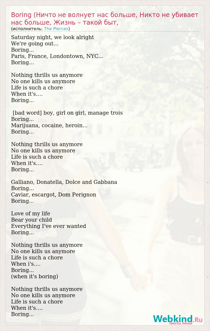 Saturday night, we look alright We're going out... Boring... Paris, France, Londontown, NYC... Boring... Nothing thrills us anymore No one kills us anymore Life is such a chore When it's…. Boring... [bad word] boy, girl on girl, manage trois Boring... Marijuana, cocaine, heroin... Boring... Nothing thrills us anymore No one kills us anymore Life is such a chore When it's…. Boring... Galliano, Donatella, Dolce and Gabbana Boring... Caviar, escargot, Dom Perignon Boring... Love of my life Bear your child Everything I've ever wanted Boring... Nothing thrills us anymore No one kills us anymore Life is such a chore When i's…. Boring... (when it's boring) Nothing thrills us anymore No one kills us anymore Life is such a chore When it's…. Boring...