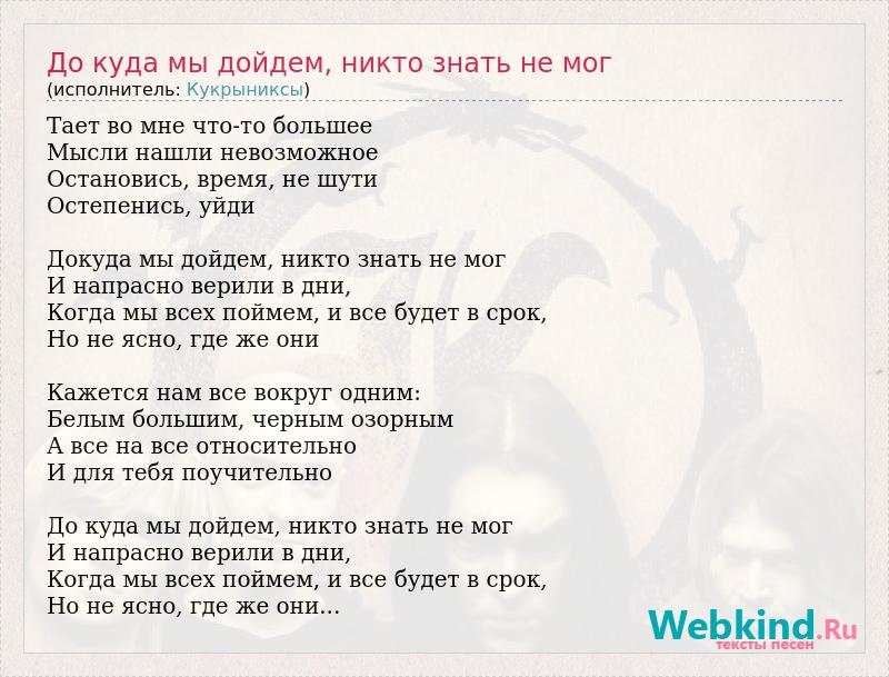 Тает во мне что-то большее Мысли нашли невозможное Остановись, время, не шути Остепенись, уйди Докуда мы дойдем, никто знать не мог И напрасно верили в дни, Когда мы всех поймем, и все будет в срок, Но не ясно, где же они Кажется нам все вокруг одним: Белым большим, черным озорным А все на все относительно И для тебя поучительно До куда мы дойдем, никто знать не мог И напрасно верили в дни, Когда мы всех поймем, и все будет в срок, Но не ясно, где же они...