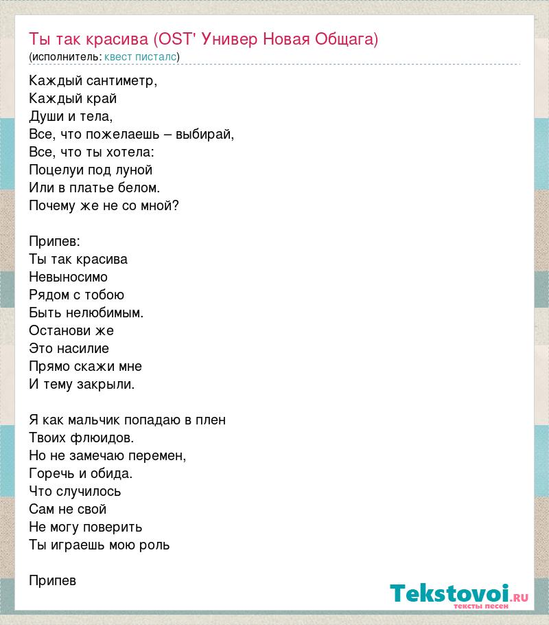 Каждый сантиметр, Каждый край Души и тела, Все, что пожелаешь – выбирай, Все, что ты хотела: Поцелуи под луной Или в платье белом. Почему же не со мной? Припев: Ты так красива Невыносимо Рядом с тобою Быть нелюбимым. Останови же Это насилие Прямо скажи мне И тему закрыли. Я как мальчик попадаю в плен Твоих флюидов. Но не замечаю перемен, Горечь и обида. Что случилось Сам не свой Не могу поверить Ты играешь мою роль Припев